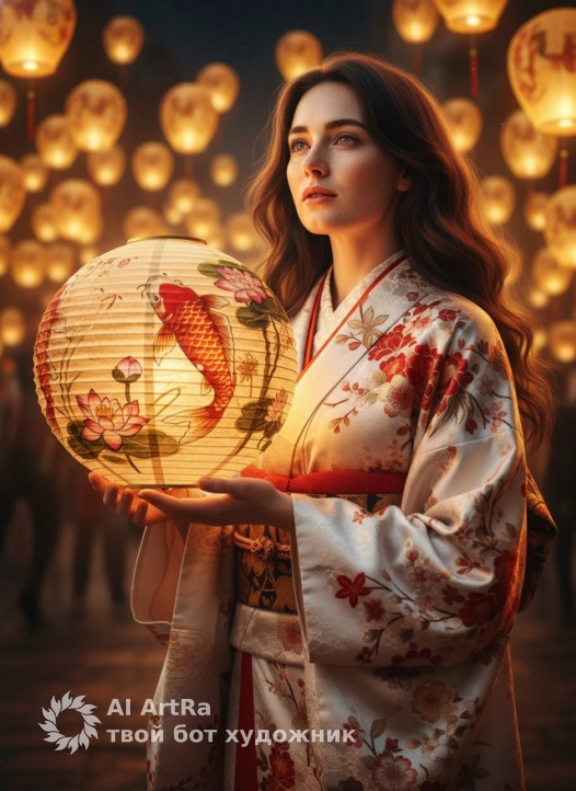 Create a photo of me, use exact attach photo do not alter. A close-up portrait of a beautiful young woman wearing an elegant white floral kimono with red and gold accents, standing at night during a lantern festival. She holds a glowing paper lantern decorated with koi fish, while golden lanterns float around her in the background. Her long dark wavy hair moves gently in the breeze, illuminated by the warm lantern light. Her eyes reflect the soft glow of the lanterns as she gazes upward with a serene and dreamy expression. Realistic human version, cinematic lighting, soft focus, detailed textures, peaceful night atmosphere, high-quality photo realism