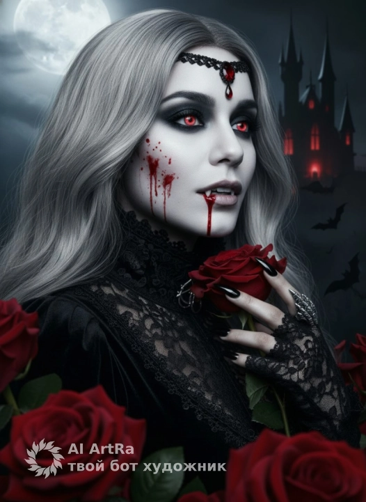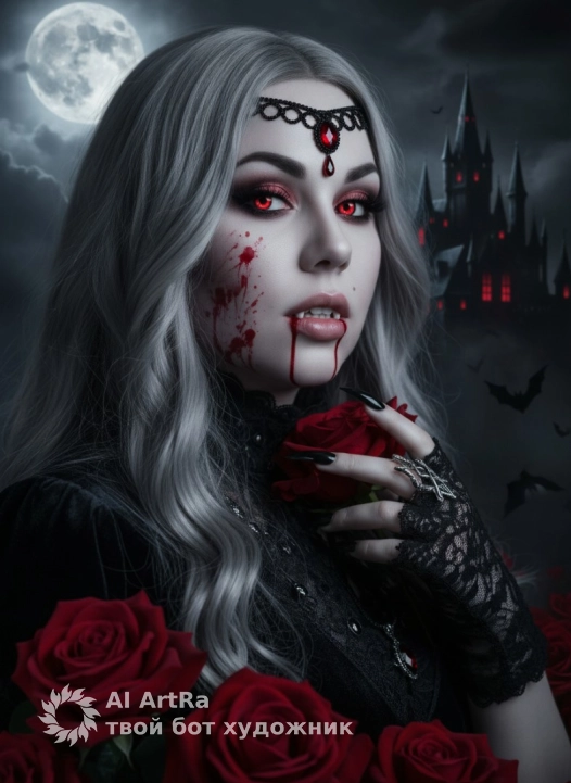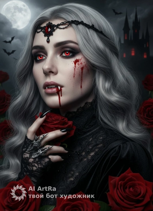 реалистичная макрофотография, небольшая глубина резкости, высокая детализация, 4K.Готический портрет девушки, не меняя черты лица, выполненный в стиле тёмной фэнтези. Погрудный ракурс (средний план), композиция вертикальная. Девушка изображена в полуанфас (три четверти), повернута вправо от зрителя. Её голова слегка приподнята, взгляд устремлён мимо камеры. Камера расположена немного ниже, что придаёт её образу величественность и лёгкое превосходство. Лицо героини бледное, фарфоровое, с холодным подтоном кожи. На правой щеке и подбородке — реалистичные алые брызги крови. Ярко-светящиеся красные радужки с узкими зрачками, тёмный smoky eyes макияж. Губы розовые, приоткрыты, видны острые белые клыки, с уголка рта стекает капля крови. Волосы длинные, пепельно-серебристые, волнистые, частично спадают на лицо и плечи.