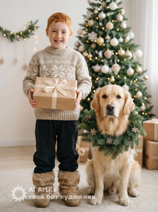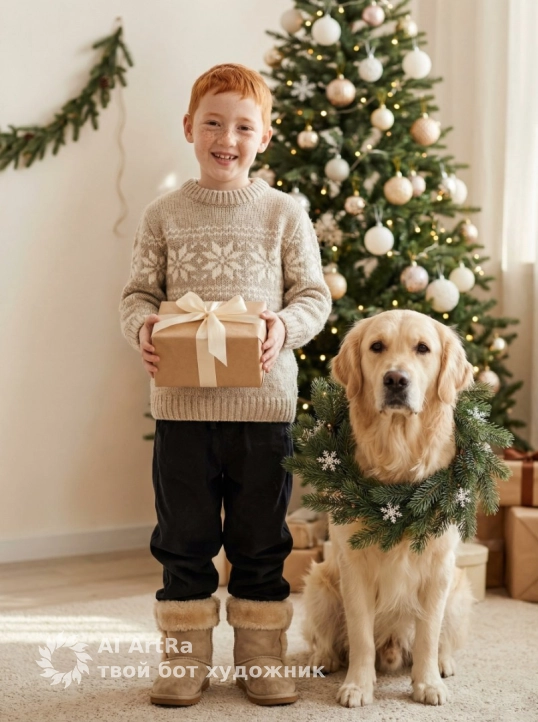 Не меняя внешности мальчика с фото, он стоит в уютной комнате, освещённой мягким рассеянным светом, который создаёт теплую атмосферу праздничного утра. Мальчик повернут лицом к камере, его глаза светятся радостью и искренней улыбкой, держа в руках аккуратно упакованный подарок в коричневой бумаге с нежным кремовым бантом. Его светло-бежевая вязаная шерстяная кофта с узорчатым центральным рисунком из снежинки выглядит мягкой и тёплой, создавая контраст с тёмными свободными брюками из плотной ткани, которые слегка спадают на пушистые зимние ботинки светло-коричневого оттенка с густым мехом по краям. Рядом с мальчиком сидит собака породы золотистый ретривер, украшенная праздничным венком из зелёных еловых веток и маленьких декоративных снежинок, её взгляд направлен вперёд, выражая спокойствие и преданность. На заднем плане мягко размывается мерцающая рождественская елка, украшенная шариками пастельных оттенков белого и золотого, а также огоньками, которые создают атмосферу волшебного праздника. Тонкая гирлянда на стене слева добавляет дополнительное теплое свечение, подчеркивая домашний уют, а несколько подарочных коробок, частично скрытых справа, завершают композицию, наполняя сцену праздничным ожиданием. Свет мягко ложится на лица и текстуры, раскрывая каждый элемент сцены с изысканной детализацией, придавая фотографии кинематографическую глубину и живость, фотореалистичное изображение, высокая текстурная детализация, высокое качество, разрешение 4K.