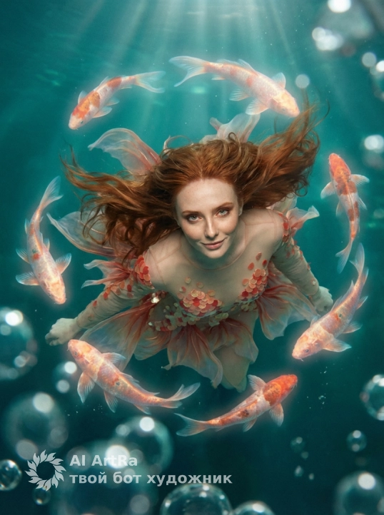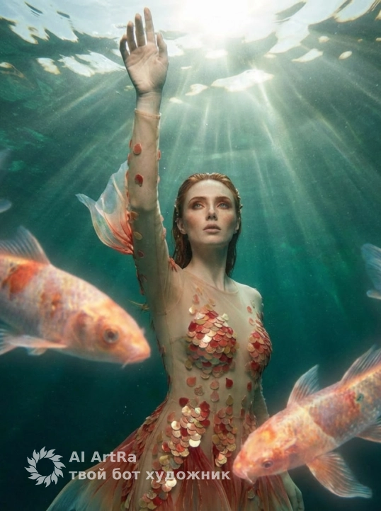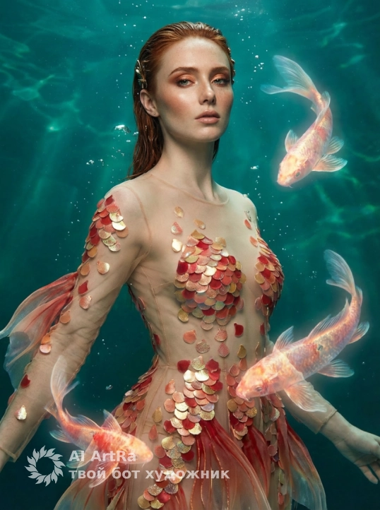 Используйте точные черты лица на фотографии. Ультрадетализированная, гиперреалистичная фотосессия в стиле люкс, на которой эффектная женщина предстает в почти иллюзорном платье от кутюр, вдохновленном драгоценными камнями карпа кои. Платье прозрачное от верха до низа, выполнено из ультратонкой сетки телесного цвета и струящейся органзы, со стратегически расположенными переливающимися аппликациями в виде рыбьей чешуи огненно-красного, кораллово-розового, расплавленного золота и нежно-персикового цветов. Эти аппликации покрывают только ключевые области — грудь, бедра и туловище — создавая едва заметный, иллюзорный эффект, намекающий на обнаженность, но при этом остающийся изысканным и утонченным. Дизайн отличается эффектным глубоким декольте, открытыми боками, открытой спиной, высоким разрезом на бедре и струящимися плавниками от бедер и шлейфа, струящимися, как жидкий шелк под водой. Нежные жемчужины, золотая филигрань и украшения из драгоценных камней перекликаются с богато украшенными драгоценностями карпа кои. Сияющие, неземные карпы кои, сотканные из света и воды, нежно кружатся вокруг ее тела, касаясь изгибов и скользя по прозрачной ткани, создавая иллюзию того, что она является частью волшебного подводного мира. Движение платья и рыб создает соблазнительный, текучий, почти неземной эффект. Макияж – чувственный, как в журнальной фотосессии: сияющая, словно стеклянная кожа, бронзовые и скульптурированные скулы, золотисто-коралловые дымчатые глаза, четкая стрелка, пушистые ресницы, блестящие губы телесно-розового оттенка и легкий хайлайтер для подводного сияния. Прическа – эффект мокрых волос, ультрасексуальная: зачесанные назад волосы, низкий пучок с распущенными прядями или струящиеся влажные волны, подчеркнутые изящными золотыми водными украшениями для волос. Фон – кинематографическая, глубокая бирюзовая и изумрудная подводная среда с драматическим освещением, парящими прозрачными тканями, мягкими пузырьками и рябью воды, создающая неземное и чувственное настроение. Поза уверенная и провокационная — выгнутая спина, длинные ноги и взгляд прямо в камеру. Снято в стиле модного журнала класса люкс, Vogue / Numéro / Harper’s Bazaar, сверхвысокое разрешение 8K, четкая фокусировка, малая глубина резкости, драматическое освещение, фантазийный реализм высокой моды, чувственный, смелый, гламурный шедевр