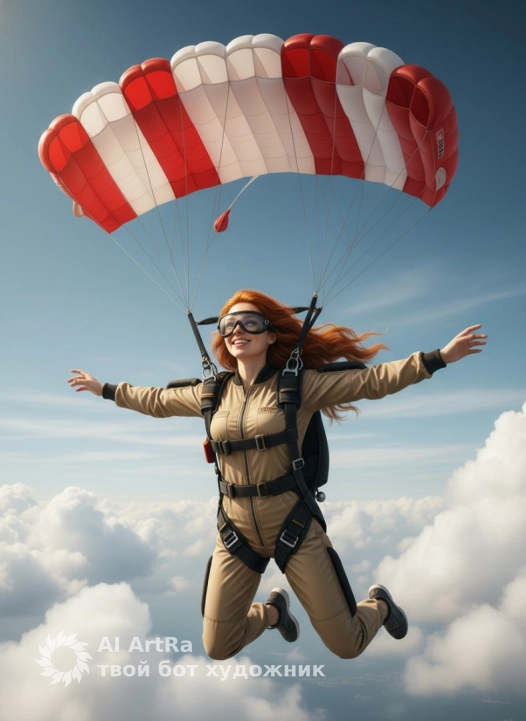Девушка в прыжке с парашютом, в воздухе, в небе с мягкими облаками. На ней бежевый парашютный комбинезон, черная сбруя и крепления, защитные очки. Парашют раскрыт над головой, красно-белые секции купола. Девушка улыбается, раскинув руки, динамичная поза свободного падения. Освещение дневное, яркое, реалистичная передача текстур. У девушки волосы, слегка развевающиеся на ветру.Use the user's appearance 1:1 — face, skin, hair and body without any changes.