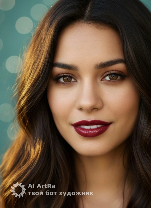 Ultra-close portrait emphasizing lips, eyes, and hair texture. Soft teal background blurred into creamy bokeh. Her red lipstick is glossy, eyes sharp with reflective highlights. Gentle golden rim light accentuates her hair. Cinematic beauty aesthetic, ultra-detailed skin, realistic pores, magazine cover style.