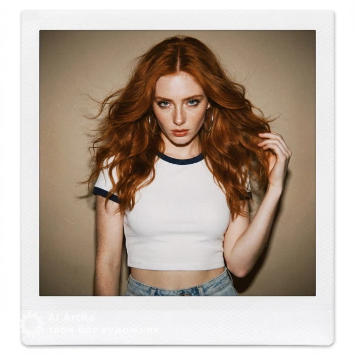 Эстетика: В обрамлении белой рамки отпечатка с Polaroid/мгновенной камеры. Освещение напоминает стиль цифровых фотоаппаратов 2000-х годов: темное, прямое освещение, едва заметные блики на объективе и легкий теплый фильтр с мягким фокусом, что создает ностальгическую, лоу-файную эстетику.