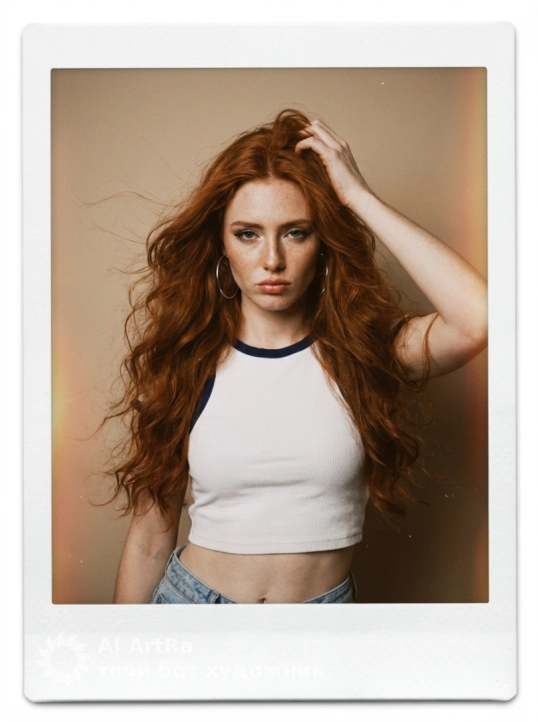 Фон: Однотонная, слегка бежевая стена студии. Основное изображение помещено в толстую белую рамку мгновенной фотопечати.