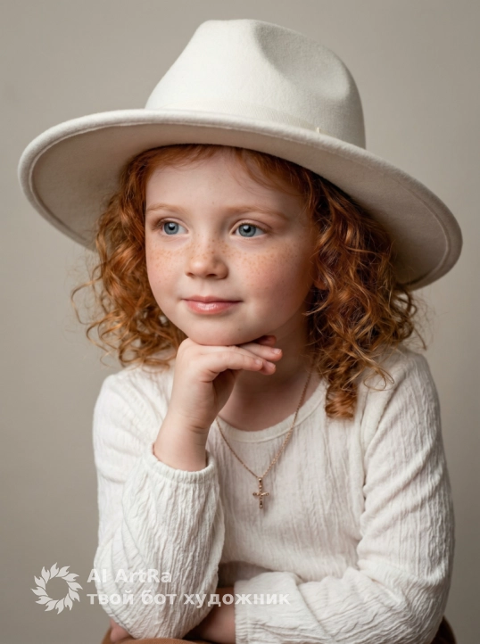 Используйте внешний вид пользователя, референса 1:1 — лицо, кожу, волосы и тело без каких-либо изменений. Девочка в широкополой белой фетровой шляпе с тонкой лентой по окружности, одета в белую длинно рукавную рубашку с рельефной текстурой ткани, на шее — тонкая цепочка с небольшим крестиком; поза — сидя, слегка наклонив голову, правая рука поддерживает подбородок, пальцы мягко прижаты к щеке, взгляд направлен в сторону от камеры с легкой улыбкой; макияж естественный — подчеркнуты брови, тонкий слой румян на скулах, губы с легким блеском, ногти естественной длины, без лака; фон — однотонный светло-серый студийный, освещение мягкое, рассеянное, с легким боковым светом, создающим нежные тени на лице и шляпе; стиль — высокореалистичная студийная фотография, композиция — средний план, ракурс слегка снизу, камера на уровне глаз, атмосфера — спокойная, нежная, задумчивая, с ощущением уюта и чистоты.