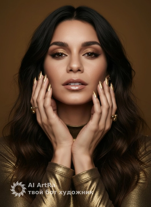 Используйте внешний вид пользователя, референса 1:1 — лицо, кожу, волосы и тело без каких-либо изменений, с акцентом на роскошный вечерний макияж: дымчатые тени с золотистым перламутром, чётко очерченные брови, подводка с лёгким стрелочным эффектом, глянцевые розово-золотые губы, безупречный тональный фундамент с мерцающим хайлайтером на скулах и переносице; маникюр — длинные, остроконечные ногти в зеркальном золотом покрытии с тонкой гравировкой; украшения — массивное кольцо с узором из золотых шариков на правом безымянном пальце, тонкое кольцо на левом среднем пальце, минималистичные золотые серьги-гвоздики; главный объект — женщина в облегающем металлическом золотом топе с высоким воротником и длинными рукавами, позирует с поднятыми руками, ладонями к лицу, пальцы слегка изогнуты, взгляд прямой, губы слегка приоткрыты; художественный стиль — гиперреализм с элементами цифровой ретуши, как в модной рекламе; фон — однотонный глубокий золотисто-коричневый, без текстур; освещение — мягкое студийное, с боковым ключевым светом, создающим блики на одежде и коже, тёплые тона, настроение — роскошное, чувственное, элегантное; камера — фронтальный ракурс, средний план, кадр обрезан по грудь, композиция симметричная, акцент на лице и руках; атмосфера — загадочная, уверенная, гламурная, с намёком на сексуальность.