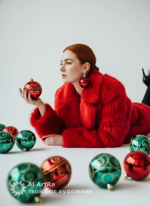 Не меняя внешности женщины с фото, она лежит на полу в окружении новогодних шаров зелёного, бирюзового и красного с золотистыми узорами, создавая праздничную атмосферу. Тело горизонтально, лицо слегка повернуто влево, взгляд задумчивый и отстранённый. В ярко-красном пальто с длинным пушистым ворсом, придающим текстуру и объем. На ногах частично видны чёрные туфли или сапоги на высоком каблуке, добавляющие контраст к красно-зелёному колориту. Волосы аккуратно собраны назад, открывая профиль. В ушах и руке крупные красные ёлочные шары, блестящие и текстурные, рука изящно поднята, пальцы мягко изгибаются, подчёркивая хрупкость и праздничное значение. Мягкое равномерное освещение подчёркивает блеск кожи и яркие цвета, создавая ровные тени и глубину. Фон белый, минималистичный, акцент на фигуре и шарах, эмоциональная выразительность сцены и насыщенность. Композиция с перспективным ракурсом, стеклянные украшения на переднем плане слегка размытие, фокус на лице и руке, баланс реализма и художественной стилизации. Атмосфера ожидания праздника и теплоты, богатство текстур и оттенков, фотореалистичное изображение, высокая детализация, качество 8K.