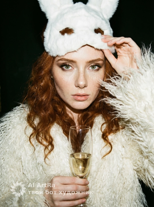 Кинематографический экстремально близкий портрет женщины.Она смотрит в камеру, в одной руке держит бокал с шампанским, а другая рука придерживает маску на лбу в виде зайки/кролика.Женщина одета в белую меховую шубу с длинным,кудрявым ворсом. На голове маска белая из меха виде зайки/кролика.Волосы распущены с волнами.