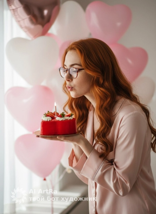 Создай высококачественное цветное фото по моему селфи. Лицо и форма головы оставить идентичными оригиналу: без ретуши и сглаживания, без изменения черт, возраста и пропорций. Сохранить натуральную текстуру кожи, поры, мелкие несовершенства и естественную природную асимметрию лица, линию роста и цвет волос. Я стою в светлой комнате, мягкий дневной свет из окна сбоку, нейтральный размытый фон с воздушными шариками в виде сердечек белого и розового цвета. На мне светлая шелковая пижама нежного розового оттенка. Волосы уложены в мягкие волны, длина и цвет как на исходном фото. Поза: Крупный вертикальный кадр 3:4 по пояс. Я держу в одной руке небольшой торт в форме сердца, ярко-красного цвета, с гладкой глазурью и декором из крема и ягод клубники; на торте одна тонкая зажжённая свеча. Вариант жеста (допустимо любое из двух, что выберет модель): – я слегка наклоняюсь вперёд и нежно задуваю свечу, губы сложены для выдоха, глаза направлены на свечу; ИЛИ – я аккуратно тянусь указательным пальцем к крему на торте, палец направлен к поверхности торта, остальные пальцы расслабленно согнуты, без намёка на неприличный жест. Пальцем я только слегка касаюсь крема или вот-вот коснусь его. Свет мягкий, без жёстких теней, лёгкий «фильм-лук», реалистичные цвета: тёплый красный торта, естественные тона кожи, волос и пижамы. Негативный промпт: изменение черт лица, возраста или пропорций; симметричное «инстаграмное» выравнивание лица; сильная ретушь и сглаживание кожи, бьюти-фильтр; карикатурная или мультяшная стилизация; сильное размытие лица; неоновые, слишком кислотные цвета; отсутствие шариков-сердечек или замена их на другой декор; грубые или неприличные жесты, крем на среднем пальце, демонстрация среднего пальца; рука с кремом у рта, жест «облизываю пальцы»; надписи и логотипы, водяные знаки, низкое разрешение, артефакты.