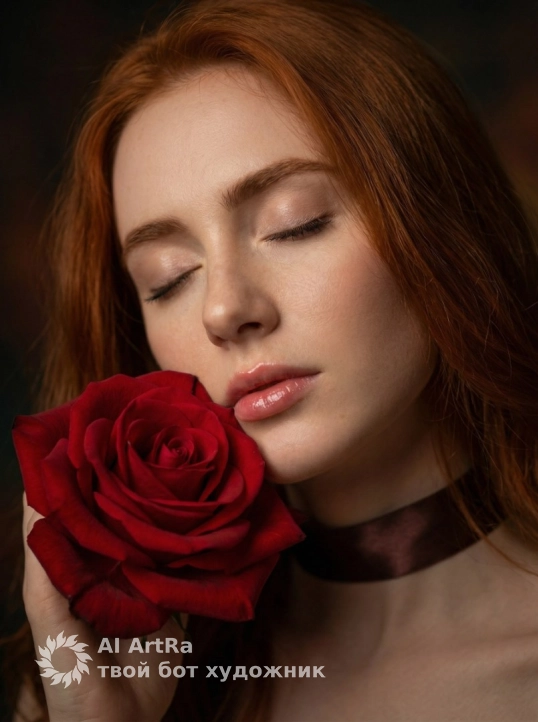 Create an artistic close-up portrait of a woman holding a large rose near her face, her eyes gently closed in a serene, emotional expression. The image captures a moment of quiet elegance and sensuality, with soft light accentuating her delicate features and the smooth texture of the rose petals. Her lips are slightly parted, touched by subtle gloss, enhancing the sense of intimacy and grace. A satin ribbon or scarf wraps around her neck, adding a touch of sophistication and contrast to the composition. The lighting is dramatic, focused primarily on her face and the rose, leaving the background softly blurred with deep, moody tones. Her hair flows naturally around her shoulders, catching faint highlights from the light source. The atmosphere should feel romantic, mysterious, and cinematic — blending beauty and emotion in a timeless, visually captivating style.