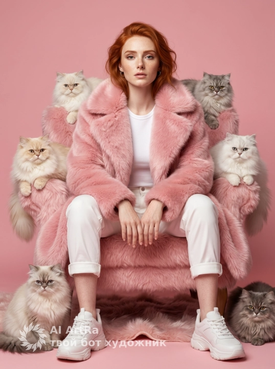 Используйте внешний вид пользователя, референса 1:1 — лицо, кожу, волосы и тело без каких-либо изменений. На изображении — женщина в позе сидя, спокойно и уверенно смотрящая в камеру, её руки сложены на коленях, ноги слегка расставлены, одна ступня чуть впереди другой; она одета в пышное розовое меховое пальто с широкими лацканами и воротником, под ним — белая облегающая футболка и белые брюки с отворотами, на ногах — высокие белые кроссовки на массивной подошве с шнуровкой; макияж нейтральный, естественный, с акцентом на чётко очерченные брови и мягкий контур губ, ногти короткие, ухоженные, без лака; на ушах — небольшие серебристые серьги-кольца; вокруг неё — роскошное розовое меховое кресло, на котором и вокруг которого расположено семь пушистых персидских котов разных оттенков (белых, кремовых, серых), они лежат, сидят и обнимают кресло, создавая ощущение тепла и уюта; фон — однотонный пастельно-розовый, без текстур, освещение мягкое студийное, рассеянное, с лёгкими бликами на меху и лице, создающее атмосферу нежности, роскоши и спокойной власти; стиль — гиперреализм с элементами цифровой живописи, камера на уровне глаз, фронтальный ракурс, средний план, акцент на центральной фигуре и её взаимодействии с котами; на полу — разбросанные мягкие ткани и меховые элементы, добавляющие глубину и текстуру сцене.