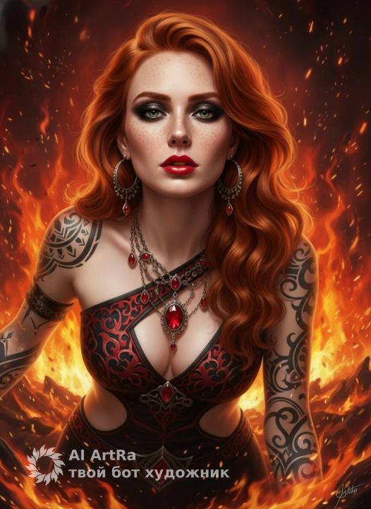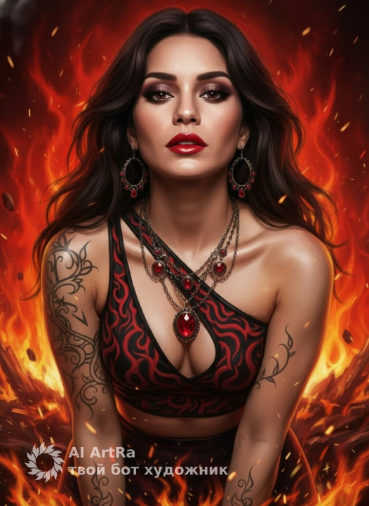 Используйте внешний вид пользователя, референса 1:1 — лицо, кожу, волосы и тело без каких-либо изменений. Цифровая фэнтезийная живопись с высокой детализацией, в стиле эпического арта, где главный объект — женщина в динамичной позе, слегка наклонившаяся вперёд, смотрящая прямо в камеру с выражением мистической уверенности; её лицо подчеркнуто драматическим макияжем: тёмные, растушёванные тени вокруг глаз, ярко-красные губы с глянцевым блеском, тонкие чёткие брови и акцент на сияющих глазах; на ушах — массивные кольца-подвески с красными камнями и металлическими деталями; на шее — сложный многослойный ожерелье с цепями и подвесками, включая крупный кулон с рубином; на плечах и руках — татуировки в стиле тёмного фэнтези с геометрическими и виньеточными узорами; на теле — облегающий топ с асимметричными вырезами, украшенный красно-чёрными орнаментами, напоминающими пламя, и с открытым животом; фон — огненная буря с яркими языками пламени, летящими искрами и тлеющими обломками, создающими эффект погружения в адский пейзаж; освещение — драматическое, с высоким контрастом, где огонь служит основным источником света, окрашивая сцену в насыщенные красные, оранжевые и чёрные тона; композиция — центральный ракурс, крупный план, с акцентом на верхнюю часть тела и лицо, камера на уровне глаз, с лёгким наклоном вверх для усиления величия; атмосфера — мистическая, опасная, наполненная силой и магией, с ощущением неизбежного напряжения и тайны.