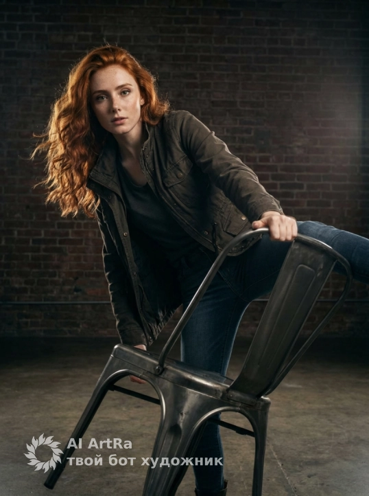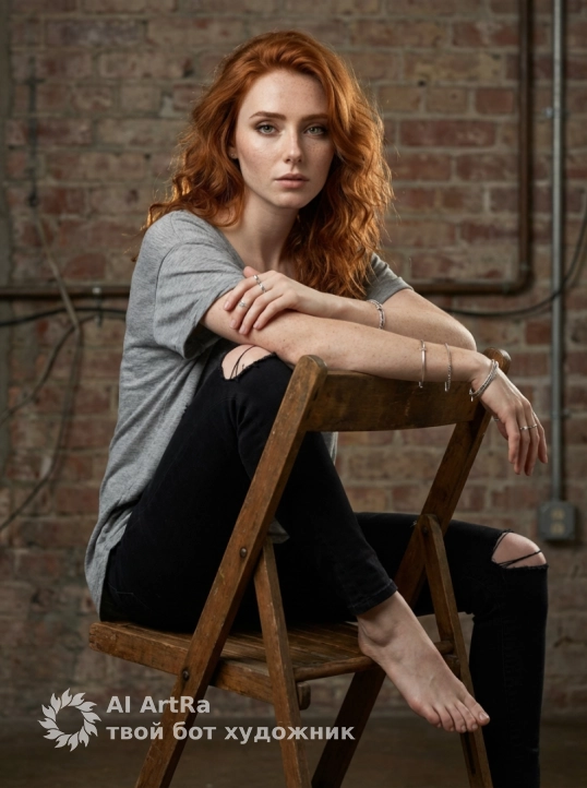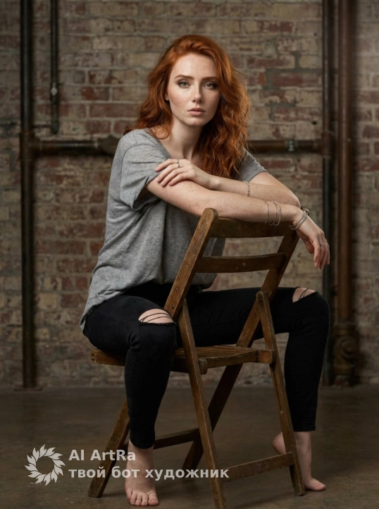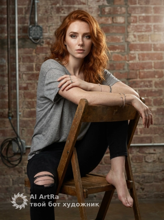 Используйте внешний вид пользователя, референса 1:1 — лицо, кожу, волосы и тело без каких-либо изменений. На изображении — человек, сидящий на старом деревянном складном стуле в студийной обстановке с фоном из потертой кирпичной стены и промышленных элементов; поза расслабленная, но выразительная — одна нога согнута, другая вытянута, руки скрещены на спинке стула, локти опираются на дерево, взгляд направлен прямо в камеру; на лице — естественный, слегка дымчатый макияж с акцентом на глаза, подчеркивающий глубину взгляда, губы нейтральные, без яркого цвета; ногти короткие, естественного оттенка, без лака; на руках — несколько тонких серебряных браслетов и несколько колец на пальцах; одежда — свободная серая футболка с короткими рукавами и черные облегающие джинсы с рваными деталями на коленях; обувь отсутствует, ступни босые, с естественным состоянием ногтей и кожи; освещение мягкое, студийное, с легким боковым контуром, создающим объем и глубину; цветовая палитра сдержанная — серые, черные, приглушенные коричневые тона кирпича и дерева; стиль — высокореалистичная студийная фотография с акцентом на текстуры и естественность; ракурс — средний план, слегка снизу, камера на уровне глаз, композиция смещена влево, оставляя пространство для фона справа; атмосфера — спокойная, уверенная, немного ностальгическая, с намеком на творческую свободу и непринужденность.