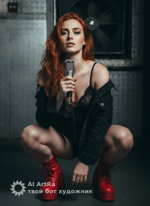 Используйте внешний вид пользователя, референса 1:1 — лицо, кожу, волосы и тело без каких-либо изменений, с акцентом на выразительный макияж: дымчатые тени с металлическим отливом, чётко прорисованные стрелки, подчёркнутые ресницы и нюдовые губы с лёгким блеском; маникюр — короткие ногти с матовым или полупрозрачным покрытием; на пальце левой руки — тонкое кольцо с минималистичным дизайном; главный объект — женщина в позе приседа, держащая в правой руке профессиональный микрофон с серебристым корпусом и сетчатой головкой, взгляд направлен прямо в камеру, выражение лица уверенное и харизматичное; стиль — гиперреалистичная цифровая фотография с элементами студийного портрета; фон — тёмный промышленный интерьер с металлическими стенами, видимым вентилятором и тенями, создающими драматический контраст; освещение — направленный боковой свет с мягкими тенями, подчёркивающий рельеф и текстуры, цветовая палитра — холодные серые и чёрные тона с ярким акцентом красных ботинок; камера — фронтальный ракурс на уровне глаз, композиция — центральный фокус на фигуре, масштаб — средний план, охватывающий фигуру от колен до макушки; атмосфера — мощная, энергичная, с намёком на рок-н-ролльный стиль; одежда — чёрный джинсовый жакет с открытыми плечами, надетый поверх кружевного топа, и ярко-красные ботинки на шнуровке с массивной подошвой; поза — симметричное приседание, колени широко расставлены, спина прямая, руки слегка согнуты, микрофон прижат к груди.