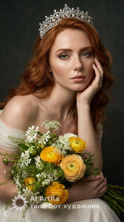 Realistic 8K high-quality image with sharp lighting and shadows. * The person's face is exactly the same as in the attached original image (emphasizing that it is "as close to the original as possible, without any modifications"). A dreamlike, high-end fashion portrait of a beautiful young woman with luminous, radiant fair skin and a glowing aura, looking directly into the camera with a soft, captivating gaze. She has hair that flows elegantly over her shoulders, adorned with an intricate, shimmering silver floral tiara encrusted with crystals and pearls. Pose & Composition: She is in a graceful seated pose, gently leaning her face against her hand, creating a high-fashion editorial look. She holds a delicate, natural bouquet of yellow ranunculus, white wildflowers, and lush green leaves. Outfit & Style: She is wearing an exquisite white sheer lace gown with intricate floral embroidery and wide, ethereal bell sleeves that create a romantic and airy aesthetic. Background & Lighting: Set against a clean, minimalist off-white studio background. The lighting is soft, bright, and diffused, creating a "high-key" effect that emphasizes her bright complexion and the delicate textures of the lace and flowers. Technical Specs: Professional photography, shot on a full-frame camera with an 85mm prime lens, f/1.8 for a soft background blur, extremely sharp focus on the face and eyes, no tattoos, hyper-realistic, 8k resolution, elegant bridal or editorial style. Aspect Ratio 9:16. The bouquet was exceptionally large.
