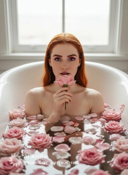 Не меняя внешности женщины с фото, создана утончённая и изысканная сцена, в которой она погружена в ванну с водой, заполненную пышными розовыми розами и лепестками, которые окутывают её в мягком и романтичном окружении. Женщина расположена фронтально, взгляд её устремлён прямо в камеру, завораживая глубиной и выразительной уверенностью. Её длинные, прямые тёмные волосы аккуратно разделены по центру, свободно спускаются по плечам, намекая на гладкую и шелковистую текстуру. Лицо подчёркнуто ярким макияжем с акцентом на глаза и веки — насыщенные розовые тени гармонируют с цветом роз, подчёркивая структуру бровей и контур глаз с густыми ресницами, всё это придаёт взгляду волнующую выразительность. Вода на её коже блестит, отражая мягкий естественный свет, льющийся с окна позади, создавая тонкие мерцающие отсветы на плечах и ключицах, подчёркивая ровную и влажную поверхность кожи. Розовые цветы вокруг неё варьируются от свежих крупных бутонов до отдельно плавающих лепестков, каждое из которых детализировано с мягкой природной текстурой. Женщина держит в руках одну розу близко к губам, словно в момент тихого созерцания или нежного дыхания, её пальцы тонко обхватывают стебель, демонстрируя плавность и изящество жеста. Фон — минималистичный и размытый, с чётко проглядывающим силуэтом белой ванны и светлым окошком, через которое проникает мягкий дневной свет, наполняющий композицию атмосферой интимности и покоя. Свет и тени в кадре выстроены так, что подчёркивают объём и формы, создавая эффект нежности и тепла, а цветовая палитра из розовых и светлых тонов усиливает романтическое и чувственное настроение этого тонко сбалансированного и глубоко эмоционального портрета, фотореалистичное изображение, высокая текстурная детализация, высокое качество, разрешение 4K.