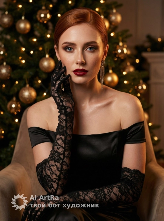 Не меняя внешности женщины с фото, перед нами изысканный и загадочный образ с игрой света и теней, создающей атмосферу роскоши и уюта. Женщина сидит перед рождественской елкой с теплым мерцающим светом и золотистыми шарами, мягко отражающими свет. Взгляд направлен в камеру, голубые глаза с насыщенным макияжем, губы в глубокий красный оттенок. Волосы собраны в гладкую прическу, подчеркивающую лицо. Она в черном платье с открытыми плечами из гладкого блестящего материала, длинные ажурные черные кружевные перчатки с цветочным орнаментом до выше локтей, одна рука нежно прикасается к щеке. Свет подчеркивает сияние кожи, текстуру губ, плечи и ключицы, тени на кружевах создают эффект бархата. Длинные сверкающие серьги-люстры ловят свет, дополняют образ. Композиция с кинематографической глубиной и теплом, мягкий свет и праздничная обстановка контрастируют с черным платьем и кружевами, передавая торжественность. Настроение — спокойная уверенность и легкая загадочность, фотореалистично, высокая детализация, 4K.