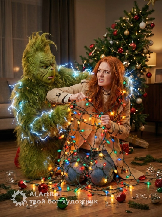 photorealistic cinematic shot. Young woman's face matches 100% to reference. She and Grinch are tangled in Christmas lights, his fur sparking with electricity while she tries to free them. Broken ornaments scatter around, tree tilting dangerously. Hyper-detailed: preserved features, dynamic struggle, lighting effects, holiday frustration