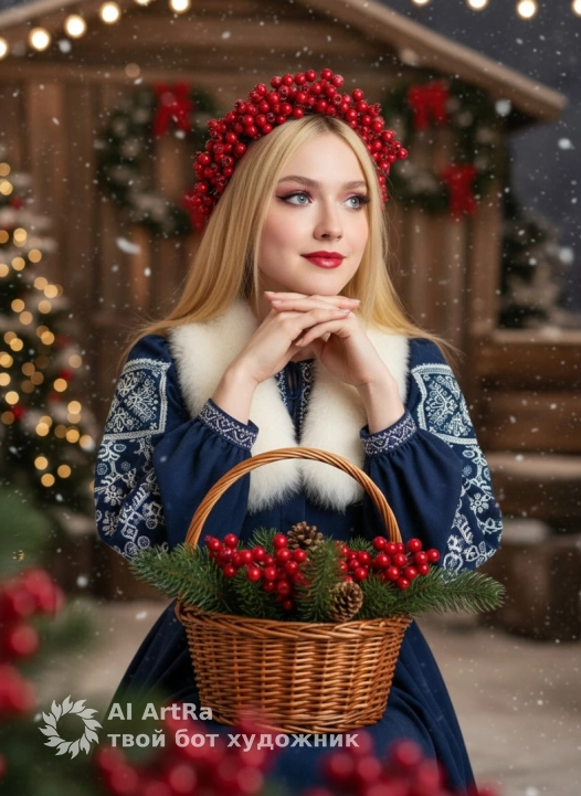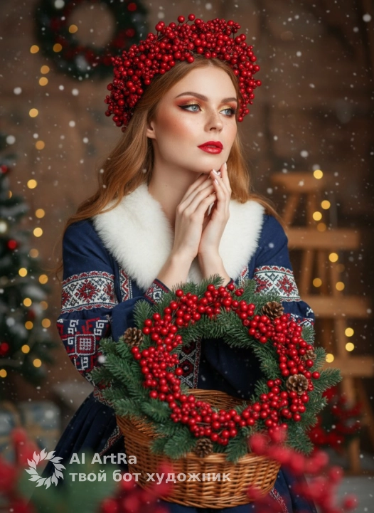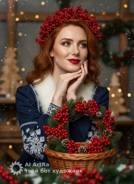 Используйте внешний вид пользователя, референса 1:1 — лицо, кожу, волосы и тело без каких-либо изменений, с ярким, аккуратным макияжем: насыщенные тени с мерцающим эффектом, чётко прорисованные стрелки, подчёркнутые ресницы, гладкие брови и сочный красный блеск на губах; маникюр — короткие, ухоженные ногти с нейтральным или прозрачным покрытием; украшения — венок из плотно собранных ярко-красных ягод, обрамляющий голову, и декоративный венок из тех же ягод и хвойных веток с шишками в плетёной корзине, которую держит в руках; главный объект — женщина в позе задумчивого покоя, с руками, подпирающими щёки, взгляд направлен в сторону, слегка вверх; художественный стиль — высокодетализированная цифровая фотография с мягким боке и кинематографическим освещением; фон — размытая зимняя сцена с падающим снегом, деревянными элементами декора, тёплыми огнями и рождественскими венками; освещение — мягкое, рассеянное, с тёплыми бликами, создающими волшебную, праздничную атмосферу; камера — средний план, ракурс немного снизу, композиция с акцентом на лицо и венок, передний план с ветками и ягодами частично закрывает нижнюю часть кадра; положение объекта — центрально, слегка повернута в профиль, взгляд устремлён вправо от камеры; масштаб — средний план, от пояса вверх; атмосфера — сказочная, нежная, зимняя, наполненная ожиданием и уютом; одежда — тёмно-синий народный сарафан с белым меховым воротником, вышивкой на рукавах и декоративными вставками на плечах; поза — сидя, руки сомкнуты под подбородком, тело слегка наклонено вперёд, выражение лица — мечтательное, с лёгкой улыбкой.