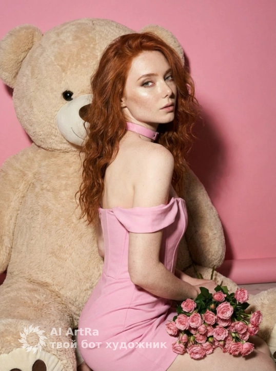 Она сидит на полу на против розовой стены. В центре кадра огромадный большой плюшевый медведь бежевого цвета. Он в два раза больше девушки. Она сидит у него между ног боком.
