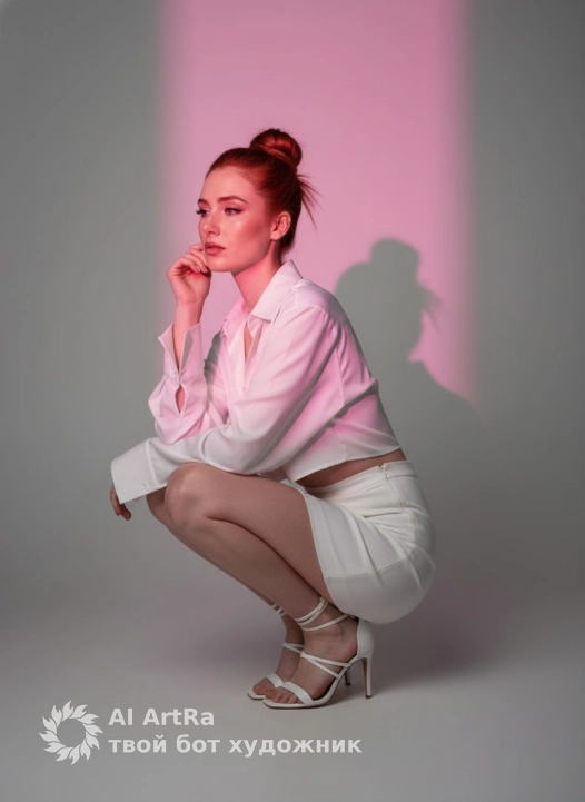 She wears a loose, cropped white shirt with long, wide sleeves. The cuffs reach mid-wrist. The hem of the shirt reveals a small strip of skin at the waist. Her skirt is white, smooth, high-waisted, slightly A-line, and mid-thigh length. She wears white sandals with a thin, high heel and multiple thin straps. The straps wrap around her calf, with open toes.