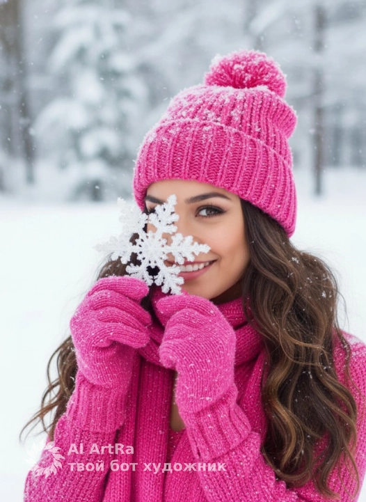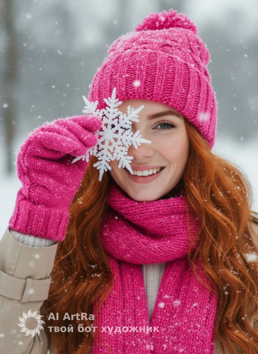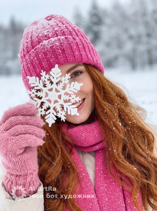 Используйте внешний вид пользователя, референса 1:1 — лицо, кожу, волосы и тело без каких-либо изменений. Женщина в зимней сцене, держащая крупную белую снежинку перед лицом, создавая игривый контраст с её улыбкой, вязаная шапка и шарф ярко-розового оттенка с мелкими блестящими вкраплениями, покрытые тонким слоем свежего снега, длинные волнистые волосы, рассыпанные по плечам, усыпанные крошечными снежинками, зимний пейзаж с размытым снежным фоном, создающий ощущение глубины и хрупкой волшебности, реалистичное фото высокого разрешения с естественным рассеянным дневным освещением, подчеркивающим текстуру вязаных изделий и кристаллическую структуру снежинки, композиция с акцентом на центральный объект через крупный план и диагональный ракурс, передающий теплоту и радость, атмосфера праздничного зимнего дня, наполненная легкостью и искренним восторгом, мягкие пастельные оттенки снежного белого и насыщенного розового, создающие гармоничный контраст, перчатки того же розового цвета с объемной вязкой, прикрывающие часть лица, поза — наклон головы в сторону, взгляд сквозь снежинку, передающий игривое любопытство и непринужденную эмоциональность.