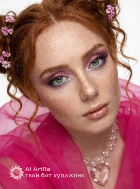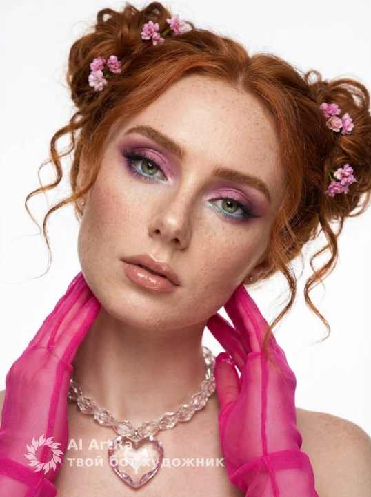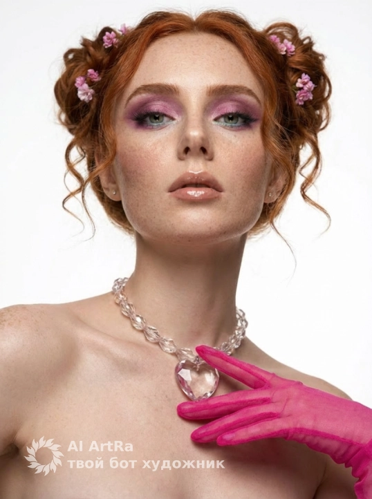 Highly detailed skin, makeup, jewelry, and hair texture, with pure color rendition, emphasizing pink and pastel tones. Highly detailed, photorealistic, shot on an 85mm portrait lens. Use the user's appearance 1:1 — face, skin, hair and body without any changes.
