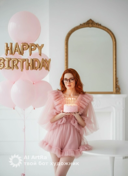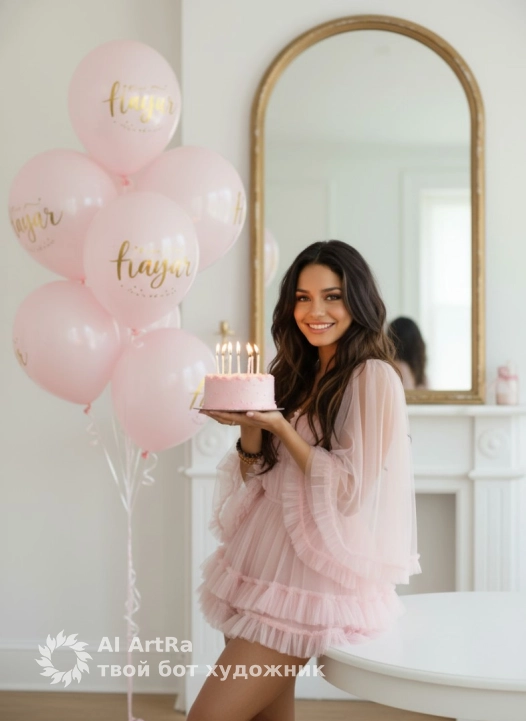 A medium-length photo of a woman standing in a bright room. She leans against a white round table and holds a small pink cake with lit candles. She is wearing a short, airy pink tulle jumpsuit with ruffles and wide sleeves. She wears an even, matte skin tone, mascara, and pink lips. In the background is a tall bunch of light pink helium balloons with gold lettering, as well as a white mantelpiece and an antique arched mirror. Bright, even, and soft studio lighting, minimal soft shadows, festive, shot with a portrait lens, medium depth of field, sharp focus on the woman, photorealistic style.Use the user's appearance 1:1 — face, skin, hair and body without any changes.