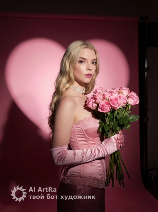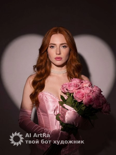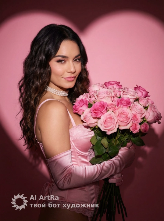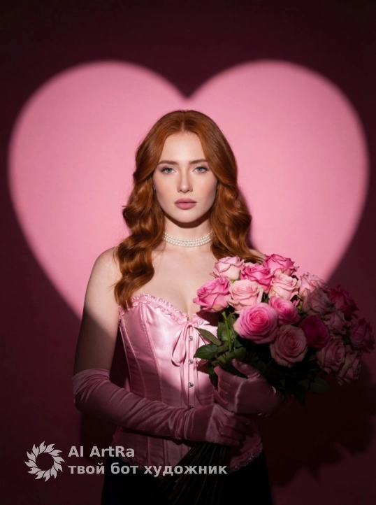 A medium-length studio shot of a woman wearing a pink corset and gloves, holding a large bouquet of pink roses, backlit in the shape of a heart against a pink background. This waist-up portrait is taken at eye level. She stands slightly to the side, looking into the camera. She has smooth, matte skin and matte pink lips. Her wavy hair is neatly styled and falls over her shoulders. She wears a pink satin corset with lace trim and lacing, and long, tight pink satin gloves. An elegant pearl choker adorns her neck. She holds a large, lush bouquet of pink roses in various shades. The room is dark, a professional photo studio setting against a simple, seamless pink background. Lighting is provided only by a projector. The projector creates a distinct highlight in the background in the shape of a heart. Everything within the projector's light is bright, while the rest of the photo is dark. Shot with an 85mm portrait lens; photorealistic.