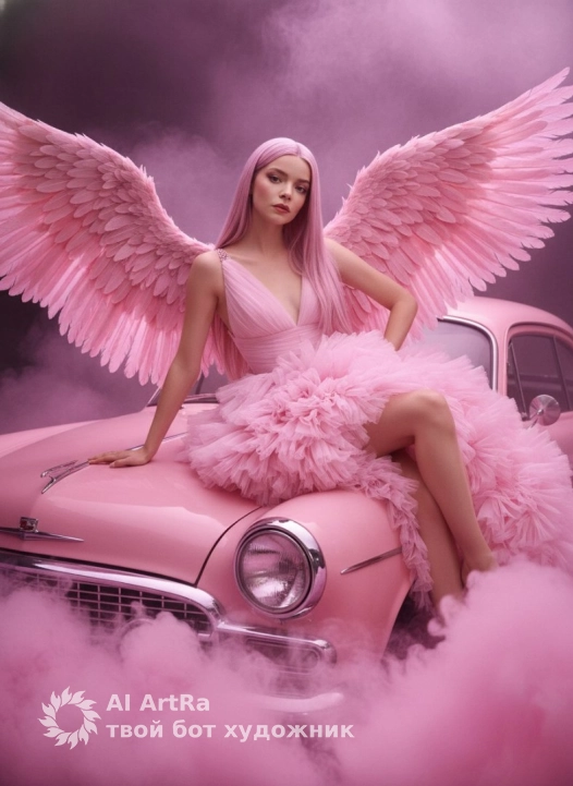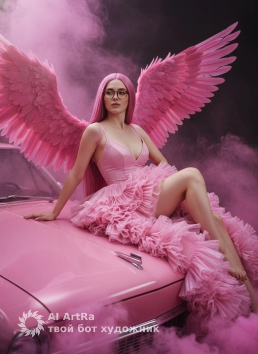 Не меняя внешности женщины с фото, перед нами предстает сцена с ярко выраженным кинематографическим настроением, наполненным магической атмосферой и мистическим светом. Женщина посажена на капот старинного автомобиля нежно-розового цвета, чья глянцевая поверхность отражает свет, подчеркивая плавность изгибов машины и создавая контраст с текстурой густого розового дыма, струящегося вокруг. Она опирается одной рукой на капот, другая рука упирается в бедро, вытянутая нога приподнята, раскрывая изящные ноги, обнаженные и освещённые так, что кожа кажется шелковистой и гладкой. Облачившись в пышное платье из множества рюш, создающих объем и движение, ткань выглядит воздушной и легкой, текстура которой переливается мягким светом, отражая оттенки розового. Верх платья, имеющий глубокий вырез, плотно облегает тело, демонстрируя тонкие бретели и аккуратные детали, подчеркивая гибкость и грациозность фигуры. Волосы девушки длинные, прямые, окрашены в холодный розовый цвет, падают ровной струей на плечо и спину, делая образ одновременно нежным и дерзким. За спиной раскрываются внушительные крылья, выполненные из множества крупных перьев насыщенного розового оттенка, каждое перо словно оживает в полумраке, создавая ощущение движения и легкости. Контраст темного, едва различимого на заднем плане пространства с нежным розовым свечением и дымом вокруг подчеркивает загадочность и величие композиции, усиливая впечатление, что перед нами не просто женщина, а мифическое создание, парящее над землей. Свет мягко падает сверху и сбоку, вырисовывая выразительные тени, которые придают глубину лицу и фигуре, не лишая образ загадочности и чувственности. Все детали композиции, от текстуры платья до отражений на капоте и структуры перьев, тщательно проработаны, создавая гармоничный и динамичный кадр, полный света и тени, движения и спокойствия, нежности и силы, фотореалистичное изображение, высокая текстурная детализация, высокое качество, разрешение 4K.