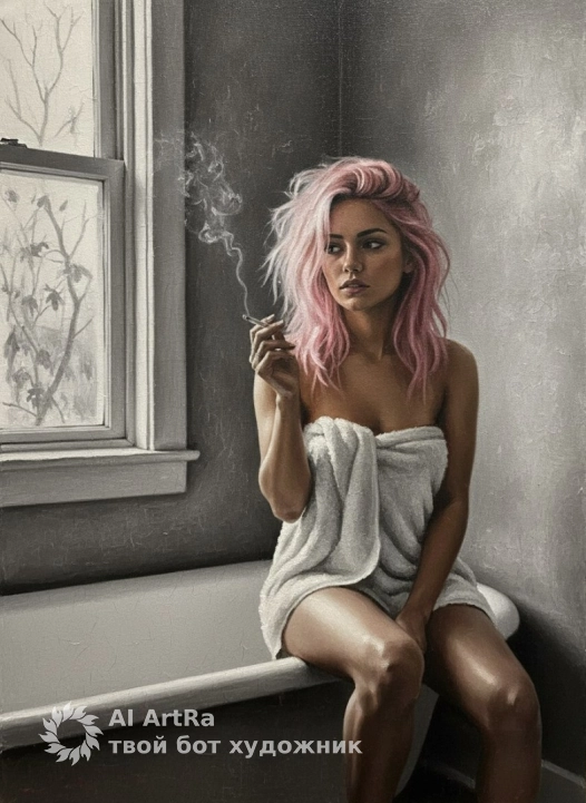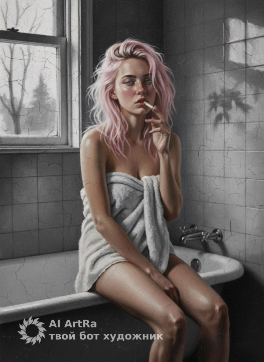 Create a tempera painting with small brushstrokes and sfumato, depicting a 19-year-old girl with a craquelure effect. A girl, using the Solve Sundsbo technique, sits on a bathtub in a bathroom. She has a towel draped over her shoulder, naked, and is smoking. Her hair is pinkish, bleached, and tousled. Her face has a Scandinavian appearance, with a casual, disapproving gaze. Dim light from the window, trees outside, ambient occlusion, shadows of tree leaves on the wall. The background is black and white, except for the girl. Unsigned. Используйте внешность пользователя 1:1 — лицо, кожу, волосы и тело без каких-либо изменений.