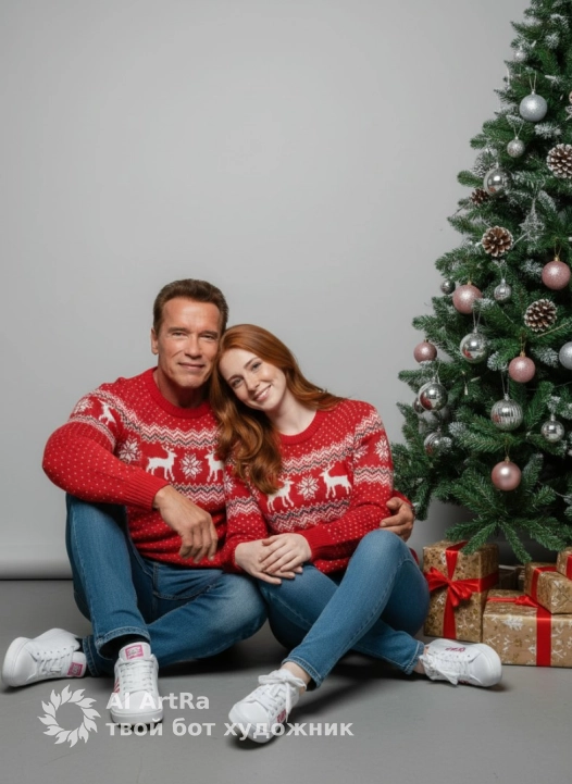 Используйте внешний вид пользователя, референса 1:1 — лицо, кожу, волосы и тело без каких-либо изменений. Два человека в красных свитерах с белыми узорами: оленями, снежинками и геометрическими орнаментами, сидят близко друг к другу на сером полу, обнимаясь — один положил руку на плечо, другой сложил ладони на коленях; джинсы синего оттенка, белые кроссовки с розовыми элементами и надписями. Фон — светло-серая стена, справа новогодняя ёлка с зелёными ветвями, украшенная серебряными блестящими подвесками, шишками и розовыми шарами, у основания — подарочные коробки с золотистыми узорами и красными лентами. Стиль: студийная фотография с высокой детализацией, мягкое рассеянное освещение создаёт тёплую атмосферу, цветовая палитра акцентирована на контрасте красного и серебряного. Камера на уровне глаз, средний план, симметричная композиция с акцентом на объединяющем жесте и праздничных деталях, передающая уют, семейное тепло и новогоднее ожидание чуда.