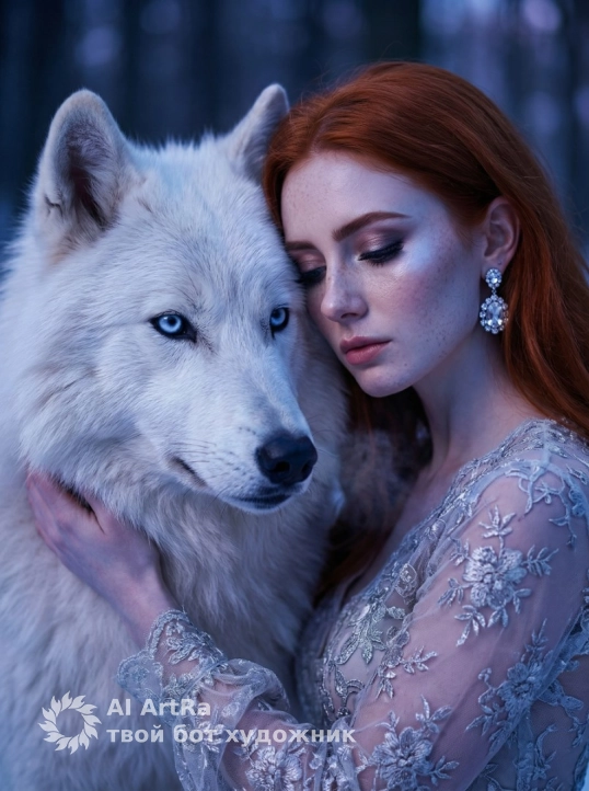 Не меняя внешности женщины с фото, показан трогательный момент близости между женщиной и белоснежным волком с пронзительными голубыми глазами. Женщина прижала лицо к густой шерсти волка, создавая ощущение единения и взаимопонимания. Кожа сияет мягким холодным светом, подчеркивающим ровность и бархатистость темного тона лица, с аккуратными бровями и дымчатым макияжем глаз с удлинёнными ресницами. Черные объемные волосы слегка растрепаны, под вечерним светом видны контуры лица и крупные сверкающие серьги с камнями. Нежное ажурное платье с серебристым блеском украшений, полупрозрачная ткань с цветочным узором и складками. Волк смотрит вперёд, его густая шерсть в тенях подчёркнута прохладным светом, глаза ярко-синие, создают мистическую атмосферу единения природы и человека. Композиция сближает героев, освещена холодным рассеянным светом, добавляющим загадочности и глубины, фон в мягкой тени. Цветовая гамма холодная, с синими и фиолетовыми тонами, передающая атмосферу ночи или сумерек с кинематографическим настроем и магией момента. Фотореалистичное изображение, высокая детализация, качество 4K.