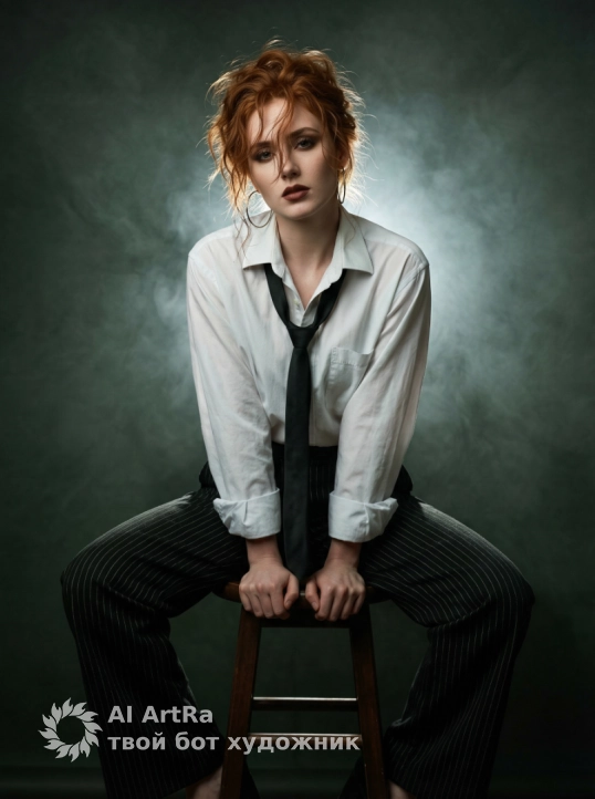 The woman is wearing a loose, white, men's shirt with long sleeves, the collar unbuttoned and wide open, a black, narrow tie tied loosely and hanging down the center of her neck, large metal hoop earrings on her ears, and black, wide, classic trousers with a light vertical pattern on her lower body. The fabric is a thick suit, the trousers are significantly flared at the bottom and fill the lower part of the frame. Below her is a dark wooden stool with rungs under her feet. The setting is a dark studio filled with smoke or fog. Behind the woman is a dense cloud of stage smoke. The background is almost black, softly transitioning to dark green and gray smoky areas. The lighting is dramatic and cinematic, with strong backlighting. One powerful cool-white light source is positioned behind and slightly above the model's head, creating a bright halo and backlight along the edges of her hair, shoulders, and upper arms. The front of her face and torso are illuminated by a weaker, diffused frontal or slightly overhead fill light. The shadows are deep and rich, with hard contrasts that drop sharply to black at the edges of the frame.