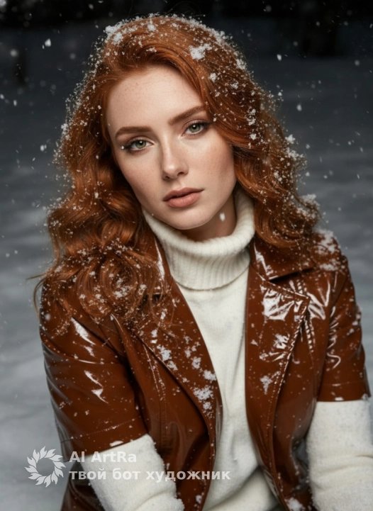 Экстремально крупный план лица Девушка сидит ночью на снегу вся в снегу, волосы в снегу. Фото со вспышкой. Волосы распущенные локонами падают на лицо. На щеках хайлайтер и на глазах в углах внутренних Ракурс с верхнего угла. Она в белой кофте с горлом и коричневой лаковой куртке короткой расстегнутой. На глазах коричневые стрелки густо прокрашенные коричневые ресницы, матовые нежно коричневые губы.