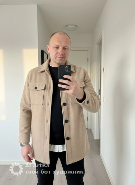 минималистичный мужской fashion/lifestyle, зеркальное селфи в интерьере локация: светлая современная квартира; белые стены, узкий дверной проём на заднем плане; модель: спокойный уверенный взгляд, лёгкий наклон головы одежда: бежевое шерстяное куртко‑рубашечное пальто (overshirt) с крупными чёрными пуговицами и двумя накладными клапанными карманами; под ним чёрный свитшот/джемпер; нижним слоем белая рубашка, подол выглядывает из‑под свитера; чёрные брюки; на запястье часы с металлическим браслетом поза: стоит перед зеркалом, держит смартфон в правой руке у лица, левая рука расслаблена внизу; корпус слегка развёрнут, выражение спокойное свет: мягкий естественный тёплый свет из окна сбоку (утро/послеполуденное), лёгкие тени на одежде и стене; Используйте внешность пользователя 1:1 — лицо, кожу, волосы и тело без каких-либо изменений.