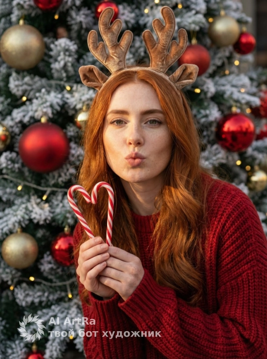 Не меняя внешности женщины с фото, кадр наполнен тёплой праздничной атмосферой мягкого бокового света, который нежно освещает её лицо и создаёт лёгкие тени, подчеркивая фактуру толстого вязаного свитера насыщенного красного цвета с выраженной вязкой. Она стоит перед украшенной пушистой елью, заснеженная хвоя которой украшена крупными матовыми и глянцевыми шарами красного и золотистого оттенков, а вокруг мерцают маленькие огоньки гирлянд, добавляющие волшебства композиции. Волосы женщины, длинные и слегка волнистые, свободно спадают на плечи, обрамляя лицо, украшенное мягкими бежево-розовыми тонами кожи. Голова венчана текстурированной бархатистой ободком в форме оленьих рожек, слегка мерцающими на свету, что добавляет игривый и праздничный акцент. Женщина слегка наклонена к камере, губы сложены в нежный поцелуй, создавая ощущение уюта и радости момента, а в двух руках аккуратно зажаты две классические конфеты в полосатой обёртке красного и белого цвета, сливаясь в форме сердца. Руки показывают естественное положение пальцев, слегка согнутых, с хорошо заметной текстурой кожи и оттенками светотени, подчёркивающими живость и реализм сцены. Фон мягко размывается, позволяя чётко выделить героиню, сохраняя ёлочные украшения в контексте пространства, что придаёт глубину и настроение праздника. Весь кадр наполнен ощущением тёплого зимнего уюта, радости и предвкушения праздника, передавая настроение вдохновения и нежности, фотореалистичное изображение, высокая текстурная детализация, высокое качество, разрешение 4K.