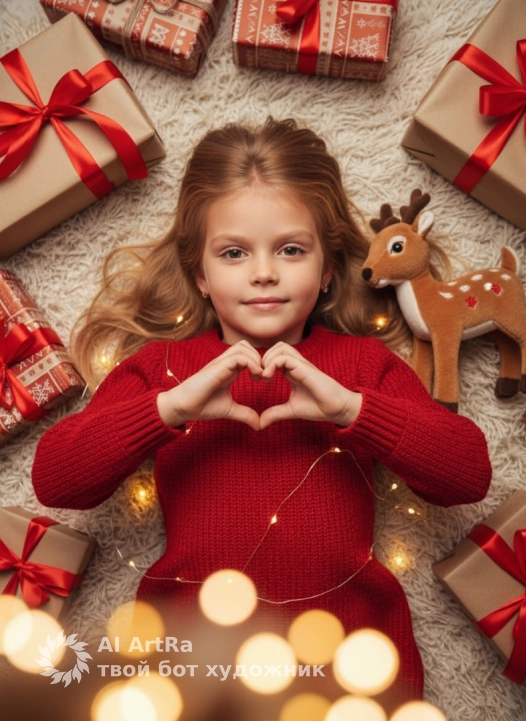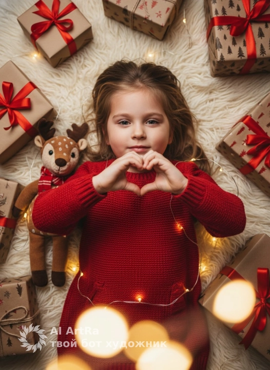 The lighting is soft, warm, and ambient. The main light source is positioned above and slightly off-camera, evenly illuminating the child's face and hands, creating soft shadows under her chin, under her arms, and along the folds of her clothing. A string of lights provides additional point sources of light, creating a soft bokeh in the foreground. The contrast is low, the shadows are blurred, without sharp edges, and the overall atmosphere is warm and festive.