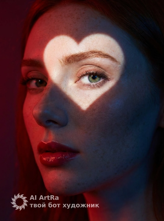 Изображение выглядит как художественный портрет с эффектной световой проекцией в форме сердца. Атмосфера — романтичная, загадочная и слегка драматичная, напоминающая кадр из модной или арт-фотосессии.