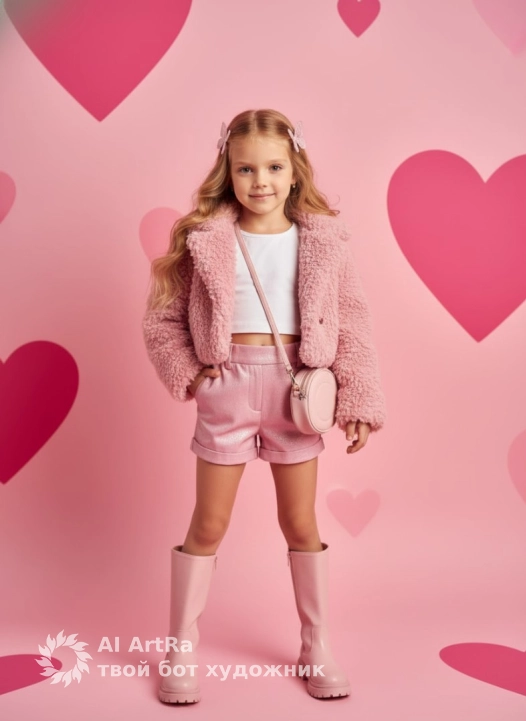 Не меняя внешности девочки с фото, изображена маленькая модница, стоящая в полный рост на розовом фоне, украшенном множеством больших и ярких сердечек разных оттенков розового, что создаёт атмосферу лёгкости и игривости. Девочка смотрит прямо в камеру с лёгкой улыбкой, выражение лица спокойное и уверенное. Её длинные волосы аккуратно уложены волнами и украшены нежными розовыми заколками-бабочками, которые гармонично дополняют цветовую гамму образа. Она одета в короткие розовые шорты из материала с чуть блестящей текстурой, сочетающиеся с высокой талией, подчёркивая её фигуру. На верхней части тела заметна объёмная, мягкая и пушистая куртка-пальто в розовом оттенке, создающая контраст текстур с гладкими шортами. Под курткой виден белый укороченный топ без рукавов, который оставляет открытым небольшой участок кожи на животе. Девочка носит высокие розовые сапоги с рельефной подошвой, которые придают всему образу современный, стильный вид. Через плечо перекинута круглая сумочка светло-розового цвета с тонким ремнём, она висит сбоку на уровне талии, добавляя элегантный акцент. Свет мягко и равномерно падает спереди, подчёркивая нежные черты лица и фактуру одежды, создавая приятные и плавные тени, без резких контрастов. Вся композиция выдержана в одной цветовой палитре розовых и белых оттенков, что подчеркивает гармоничный, возвышенный и сказочный характер сцены в стиле кино, наполненный детской невинностью и лёгкостью. фотореалистичное изображение, высокая текстурная детализация, высокое качество, разрешение 4K.