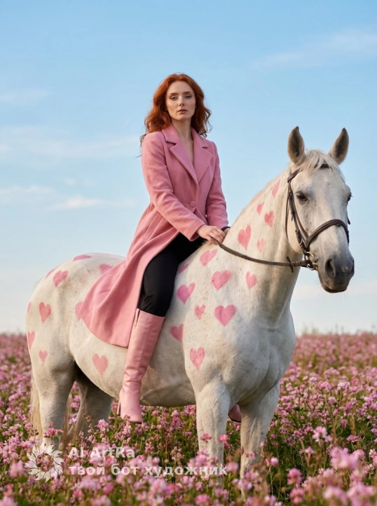 Используйте внешний вид пользователя, референса 1:1 — лицо, кожу, волосы и тело без каких-либо изменений. На изображении — женщина в элегантной позе сидит верхом на белой лошади, покрытой множеством розовых сердец, в поле, усыпанном нежно-розовыми цветами, под ясным голубым небом с легкими облаками; она одета в длинное розовое пальто с отложным воротником, черные брюки и розовые сапоги до колена, руки спокойно лежат на бедрах и поводьях; макияж минималистичный, акцент на естественной свежести лица, ногти короткие, без лака, украшений нет; стиль — гиперреалистичная цифровая фотография с мягким дневным освещением, теплыми розовыми и голубыми тонами, создающими романтичную, сказочную атмосферу; композиция — средний план, фронтальный ракурс, камера на уровне глаз, лошадь и всадница занимают центр кадра, фон мягко размыт, акцент на детализации текстур пальто, шерсти и цветов, общее настроение — спокойное, мечтательное, визуально утонченное.