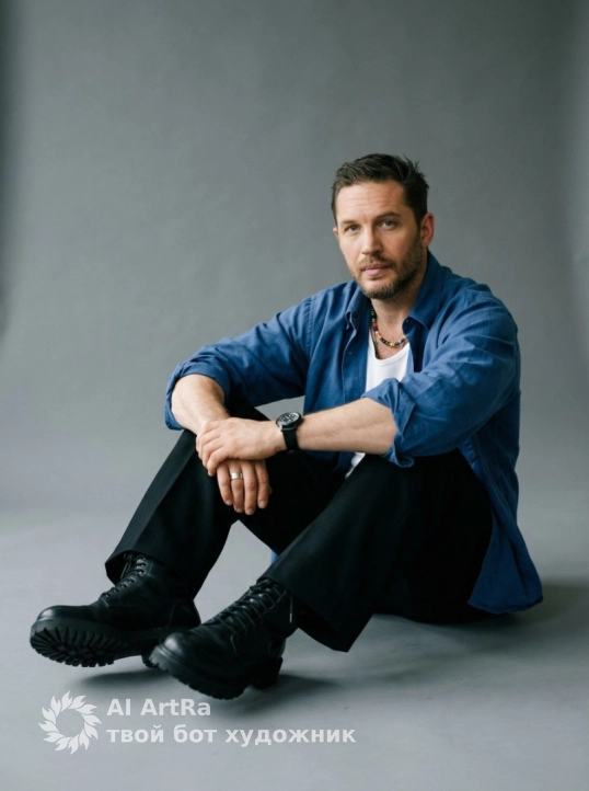 Portrait of a man sitting sideways on the floor with his hands on his knees, full-length portrait, eye-level perspective, static composition, wearing a blue oversized shirt with rolled-up sleeves, a white t-shirt, black wide-leg pants, black combat boots with thick soles, a silver ring, a black wristwatch, multi-colored beadwork around his neck, against a solid gray background in a photo studio, the wall smoothly blends into the floor, soft light from a front-lit window, soft shadows, neutral atmosphere, shot with a 50mm portrait lens, shallow depth of field, film photography style with fine grain, earthy color palette, high detail, photorealism.