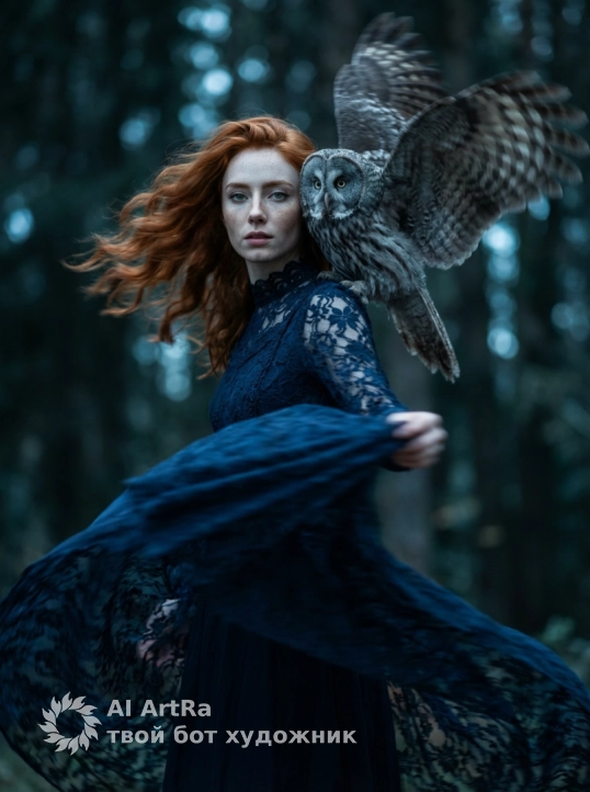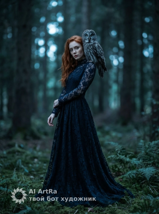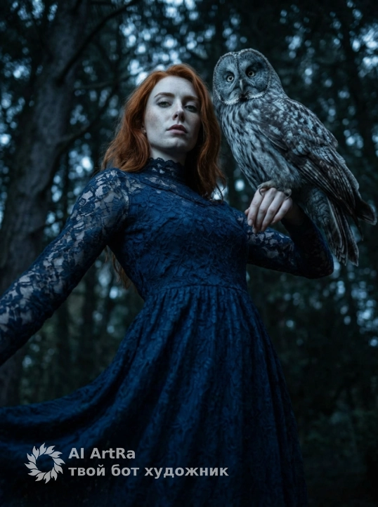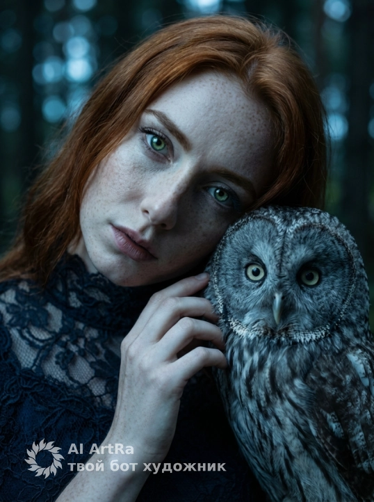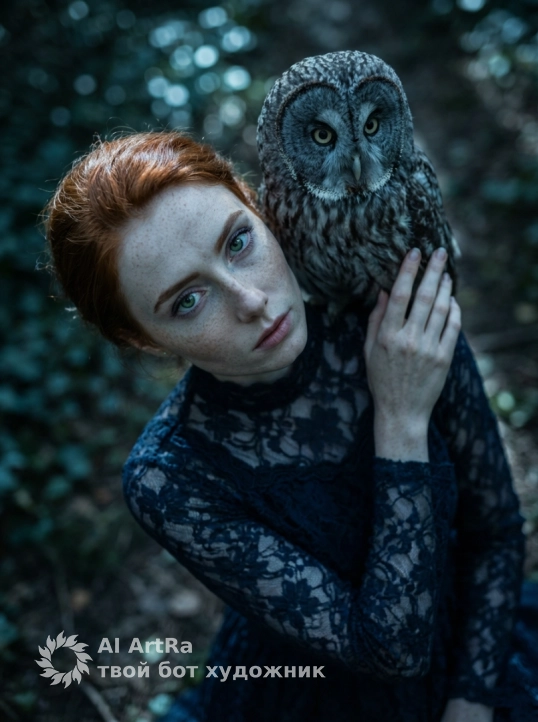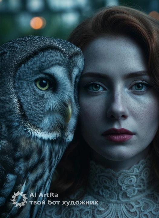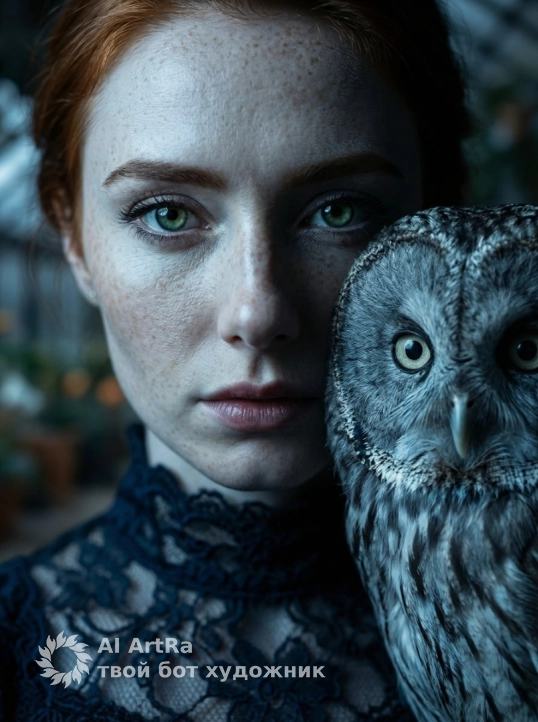 Сохрани внешность девушки с фото. Экстремально крупный план (macro shot), фокус на лицах. Лицо девушки с находится очень близко к морде серой неясыти. Девушка смотрит прямо в объектив пронзительным, немигающим взглядом, имитируя взгляд совы. Одна половина ее лица скрыта тенью. Видна каждая деталь: текстура бледной кожи, кружево высокого воротника платья и каждое перо птицы. Освещение холодное, кинематографичное, напоминающее лунный свет (moonlight), с голубоватым оттенком. Глубина резкости мала (f/1.8), фон оранжереи сильно размыт (боке). Ощущение сюрреализма и тревоги.