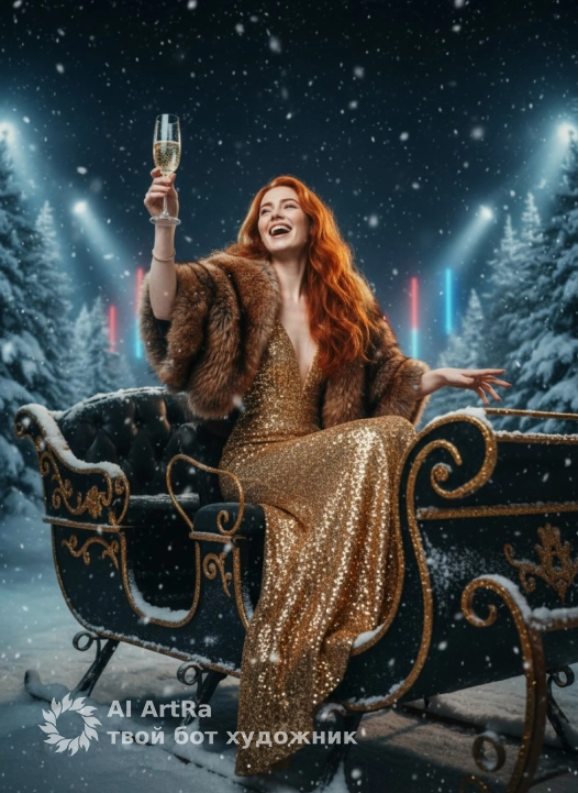 Используйте внешний вид пользователя, референса 1:1 — лицо, кожу, волосы и тело без каких-либо изменений. Женщина в роскошном золотом платье с глубоким V-образным вырезом, покрытом мерцающими пайетками, сидит на роскошных санях с черными и золотыми элементами, покрытых свежим снегом, подняв вверх хрустальный бокал с шампанским, излучая радостный смех. Ее поза динамична: одна рука в меховой накидке с текстурой коричневого и черного меха, другая касается борта саней, словно ощущая скорость. Фон — ночная зимняя сцена с падающим снегом, заснеженными елями, размытыми неоновыми огнями красного и синего цветов, яркими прожекторами, создающими контраст между темным небом и светлыми бликами на снегу. Стиль — гиперреалистичная цифровая фотография с кинематографическим освещением: теплые отблески от платья и бокала перекликаются с холодным сиянием фона, усиливая праздничное, волшебное настроение. Композиция с низким ракурсом акцентирует величественность саней и персонажа, передавая ощущение движения и торжества, а тонкие детали — снежинки в воздухе, текстура меха, блики на пайетках — создают ощущение глубины и роскоши.