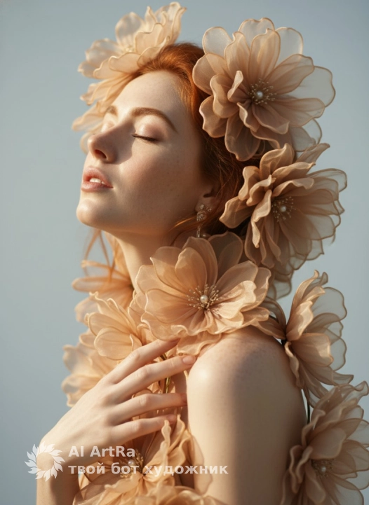 Не меняя внешности женщины с фото, представлено изящное изображение: голова слегка запрокинута, глаза закрыты в блаженной задумчивости, губы чуть приоткрыты, выражая нежность. Волосы собраны, частично скрыты крупными бежево-персиковыми тканевыми цветами с полупрозрачными, слегка волнистыми лепестками с жемчужными и золотыми деталями, окружающими шею, плечи и затылок, с текстурой шелка или органзы. Свет справа освещает лицо и цветы, создавая мягкие тени и подчеркивая объем лепестков. Рука нежно касается большого цветка, пальцы утончённые, кожа бархатистая. Серьги и украшения в ушах мерцают в свете, частично скрыты лепестками. Фон светло-голубой, нейтральный, создаёт спокойную атмосферу, акцентируя лицо и текстуры композиции. Воздушная сцена, фотореалистичная, с высокой текстурной детализацией, качество 4K.