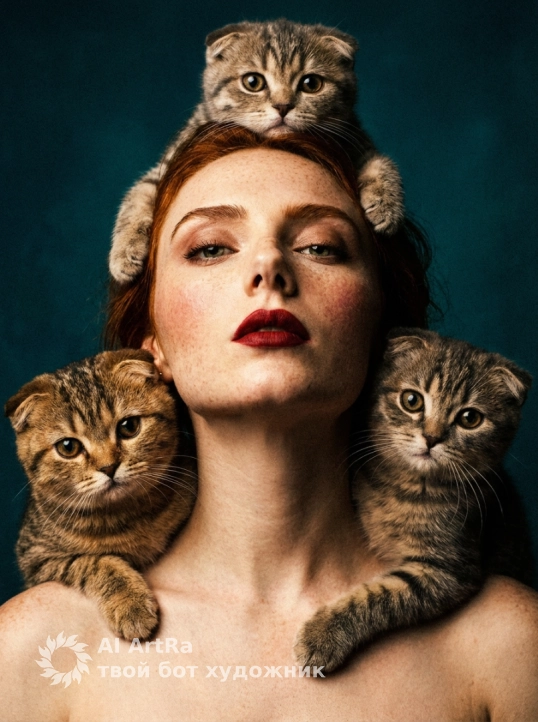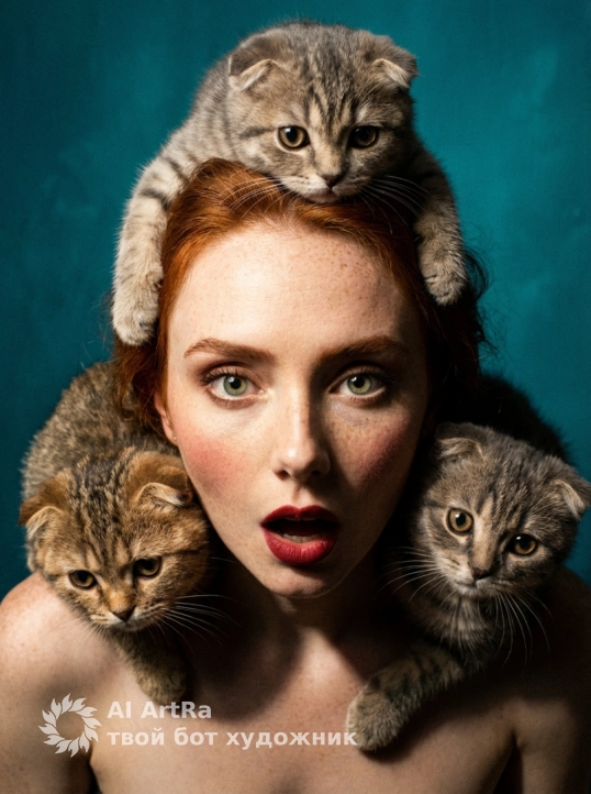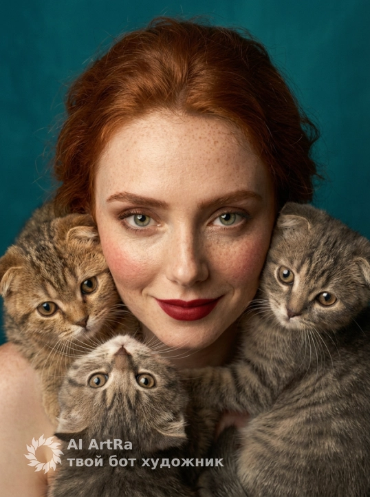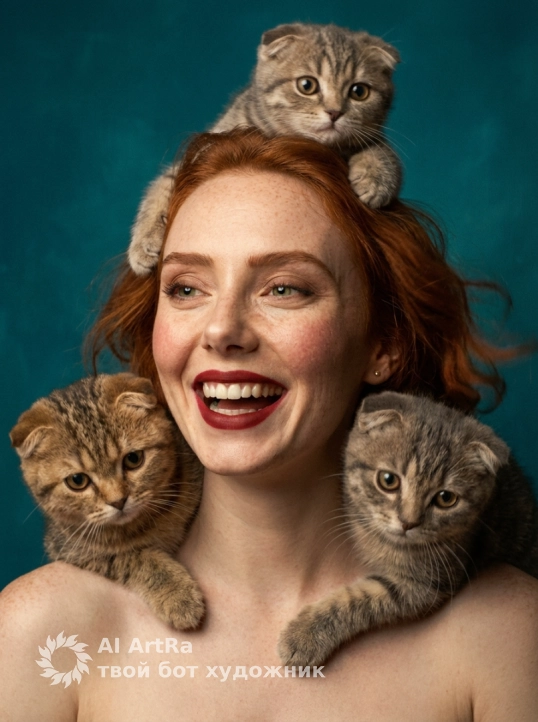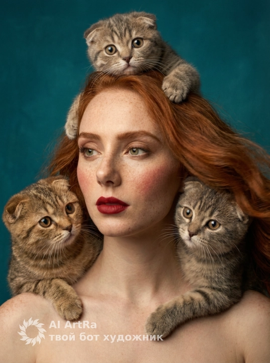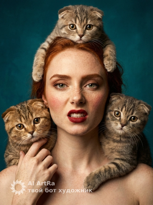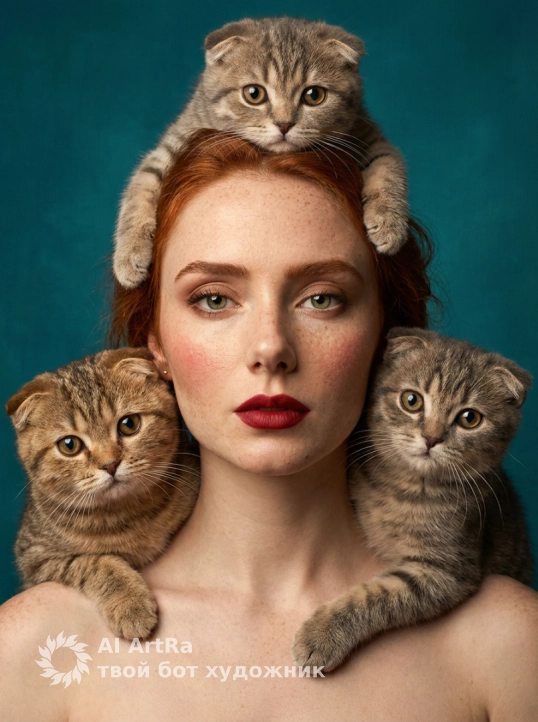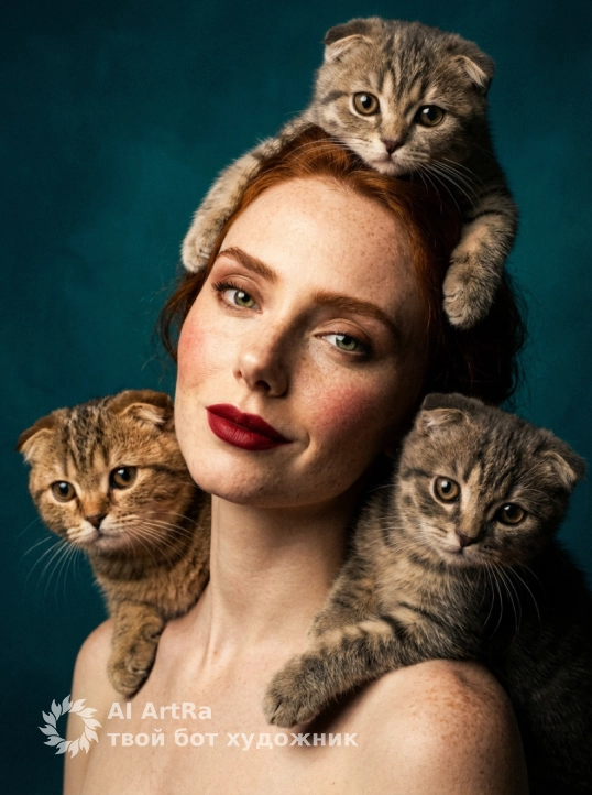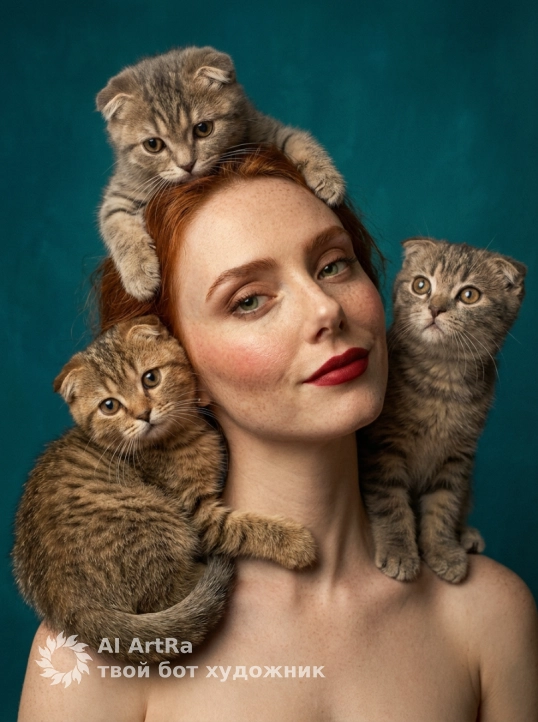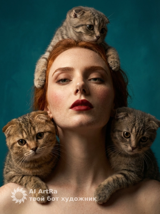 Используйте внешний вид пользователя, референса 1:1 — лицо, кожу, волосы и тело без каких-либо изменений. Портретная сцена в стиле гиперреализма с мягким студийным освещением, создающим теплые блики и нежные тени, насыщенный глубокий бирюзовый фон с текстурой холста, три шотландские вислоухие кошки: одна сидит на голове, две обнимают плечи, все с пристальным взглядом и выразительными глазами, макияж акцентирован на насыщенных губах с матовым красным оттенком и естественном румянце на щеках, маникюр и педикюр отсутствуют, украшений нет, камера на уровне глаз, композиция центрирована, ракурс фронтальный, крупный план с акцентом на лицо и верхнюю часть тела, атмосфера спокойная, интимная и немного загадочная, одежда — открытые плечи, поза — сидя, взгляд направлен прямо в камеру, эмоции — задумчивые, спокойные, с легкой дозой загадочности.