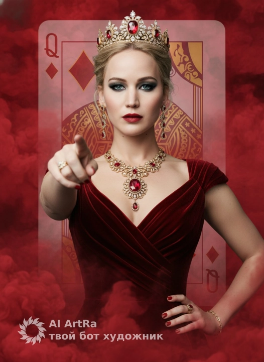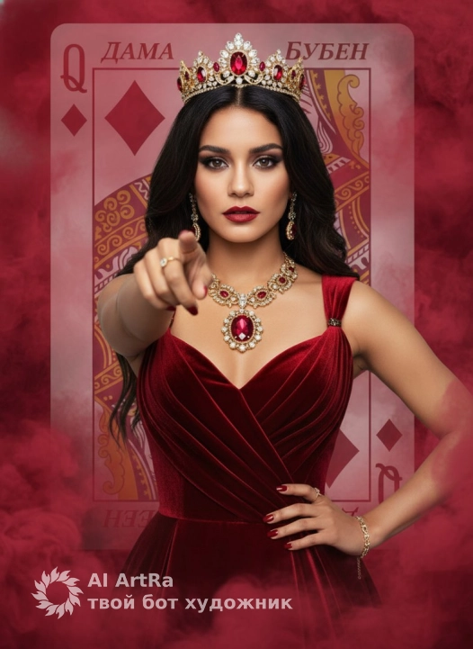 Используйте внешний вид пользователя, референса 1:1 — лицо, кожу, волосы и тело без каких-либо изменений. Женщина в роскошном бархатном платье глубокого красного цвета с драпировками и вырезом сердцем, на голове — золотая корона с рубинами и бриллиантами, на шее — ожерелье с крупным рубином в золотой оправе, на ушах — длинные подвесные серьги с камнями, на пальцах — тонкие золотые кольца, на ногтях — глянцевый красный лак, на запястье — тонкий браслет из золотых звеньев; макияж акцентирован на глазах — дымчатые тени, чёткий карандаш, подводка и объёмные ресницы, губы — насыщенный красный матовый оттенок; поза — уверенная, одна рука вытянута вперёд, указательный палец направлен прямо на зрителя, вторая рука слегка согнута и лежит на бедре; фон — огромная полупрозрачная карта «Дама Бубен» с орнаментом в стиле классических игральных карт, окружена густым красным дымом, создающим атмосферу таинственности и власти; освещение — драматическое, с мягкими бликами на бархате и ювелирных изделиях, цветовая палитра — насыщенные оттенки красного, золотого и тёмных теней; стиль — гиперреалистичная цифровая фотография с элементами фэнтези, композиция — центральный ракурс, средний план, объект занимает большую часть кадра, взгляд направлен прямо в камеру, создаёт ощущение личного вызова и величия.