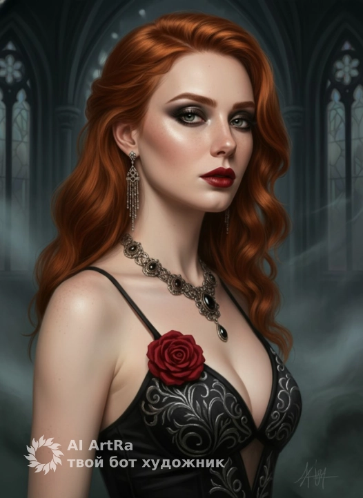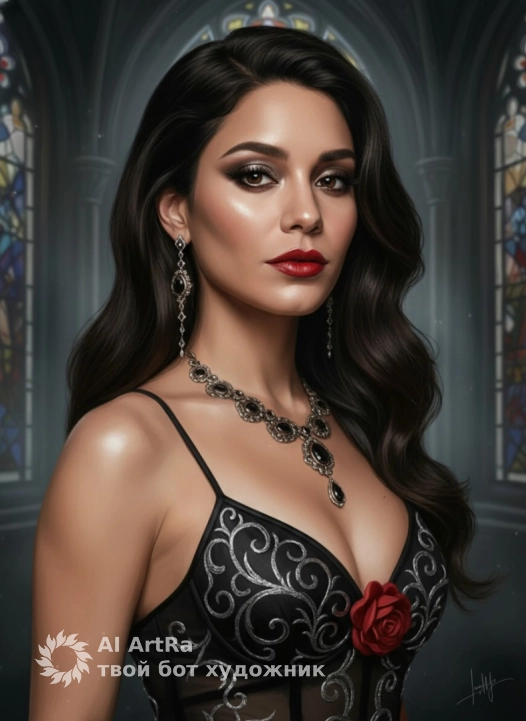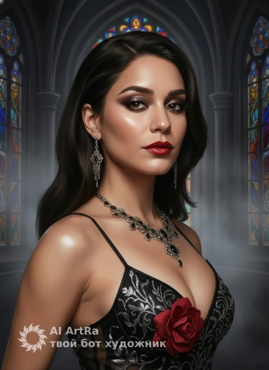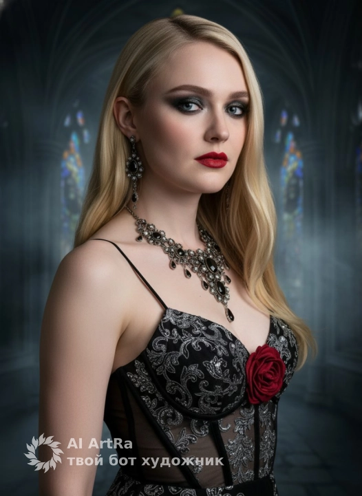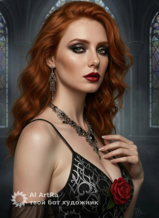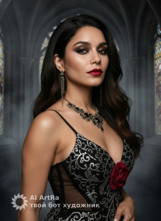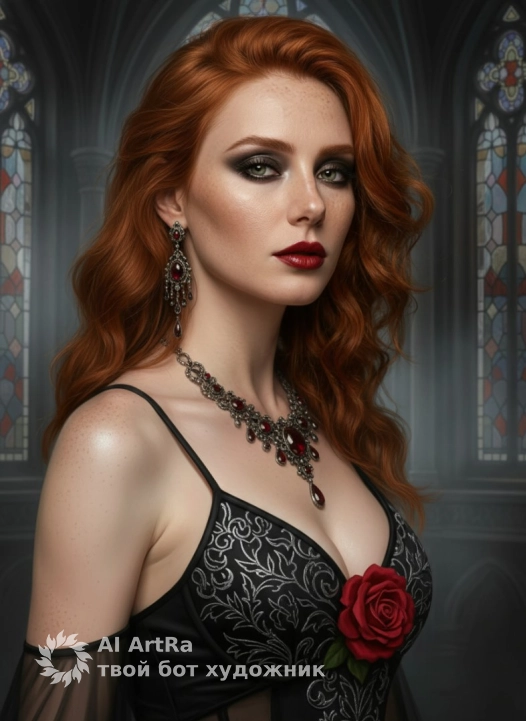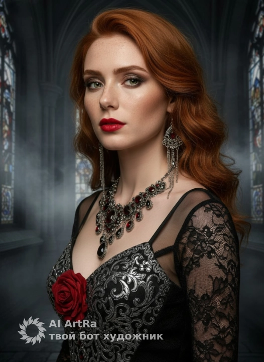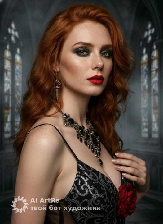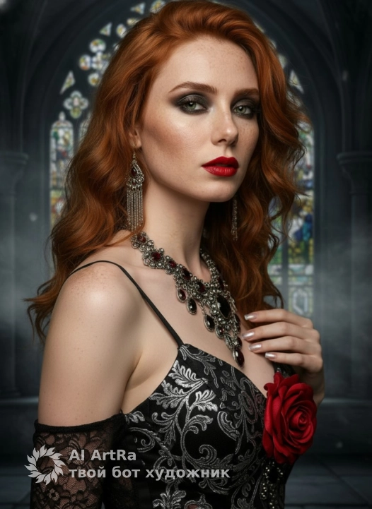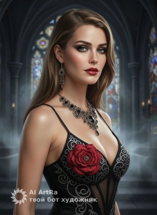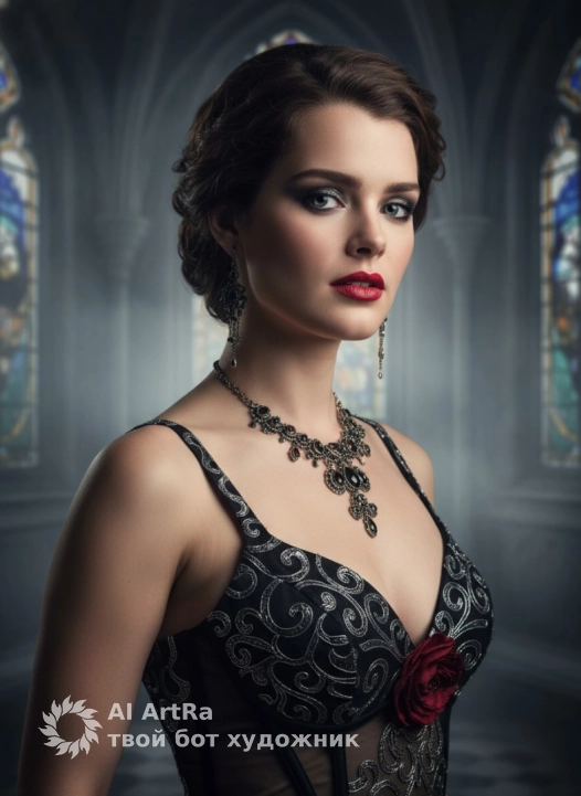 Используйте внешний вид пользователя, референса 1:1 — лицо, кожу, волосы и тело без каких-либо изменений. Изображение представляет собой фотореализм в стиле фэнтезийного реализма с элементами готической элегантности: женщина в позе полупрофиля, слегка повернутая к зрителю, с выражением спокойной загадочности, взгляд направлен в сторону, но с лёгким контактом с камерой; макияж подчёркивает глаза — тёмные, дымчатые тени с металлическим отливом, чётко очерченные брови, ярко-красные губы с матовым финишем и едва заметным блеском в центре; на шее — массивное ожерелье с винтажными узорами и тёмными камнями, уши украшены длинными, каскадными серьгами с подвесками; на ногтях — тонкий, едва заметный лак, возможно, прозрачный или с тонкой перламутровой вуалью; одежда — облегающее чёрное платье с тонкими бретельками, декорированное серебристыми узорами и красным цветком на груди, с глубоким вырезом и полупрозрачными элементами; фон — тёмный, архитектурный интерьер с каменными арками, витражами и дымкой, создающей ощущение глубины и таинственности; освещение мягкое, боковое, с акцентом на лицо и плечи, создающее контрастные тени и блики на коже и украшениях; камера на уровне глаз, ракурс слегка снизу, кадр средний, с акцентом на верхнюю часть тела; атмосфера — мистическая, благородная, с оттенком романтической меланхолии и внутренней силы.highly detailed skin texture, shot with an 85mm lens, f/1.8, under cinematic lighting, in a hyper-realistic style, in 8K resolution, in RAW format.