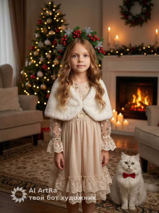 Не меняя внешности девочки с фото, кадр захватывает её восхитительный облик в полный рост, стоящей прямо и уверенно, с взглядом, направленным в камеру, что создаёт ощущение спокойствия и нежности. Она одета в воздушное, мягкое платье светло-бежевого тона с тонкой вышивкой из цветочных мотивов на лифе и рукавах, которые заканчиваются изящными кружевными оборками, создающими эффект лёгкости и изящества. Поверх платья девушка накинула нежную белую шаль с пушистой текстурой, что добавляет образу сказочную глубину и теплоту. Её светло-русые волосы свободно ниспадают длинными волнами по плечам, и венок из зелёных листьев с ярко-красными ягодами и серебристыми снежинками венчает голову, придавая ей праздничную и волшебную атмосферу. Вокруг царит мягкое, тёплое освещение, подсвечивающее девочку и создающее лёгкие тени, которые придают сцене уют и камерность, словно в новогоднем вечере у камина. На заднем плане, хотя и немного размыто, заметна украшенная гирляндами рождественская ёлка, создающая праздничный фон, а в комнате горят несколько свечей, их свет дополняет атмосферу уюта и волшебства. Рядом с девочкой сидит пушистый белый кот с зелёными глазами и красным бантиком на шее, он обращён чуть в сторону, добавляя живой и трогательный акцент композиции. Ковер с тёплыми узорами и мягкая мебель подчёркивают домашний комфорт и теплоту окружения. Сочетание нежных текстур ткани, мягкого света и зеркальной глубины пространства вокруг создают подчёркнутую кинематографическую атмосферу, которая передаёт ощущение радости и праздничного ожидания, фотореалистичное изображение, высокая текстурная детализация, высокое качество, разрешение 4K.