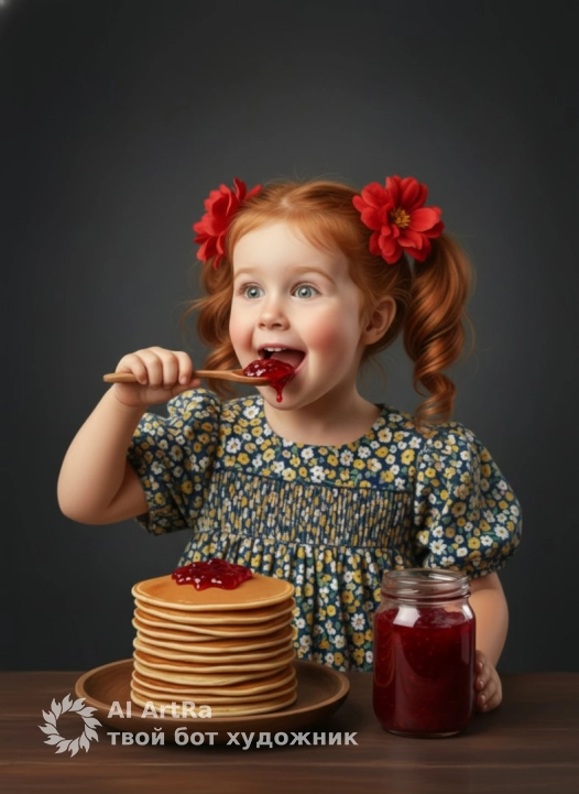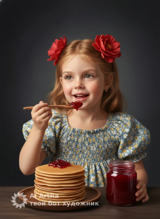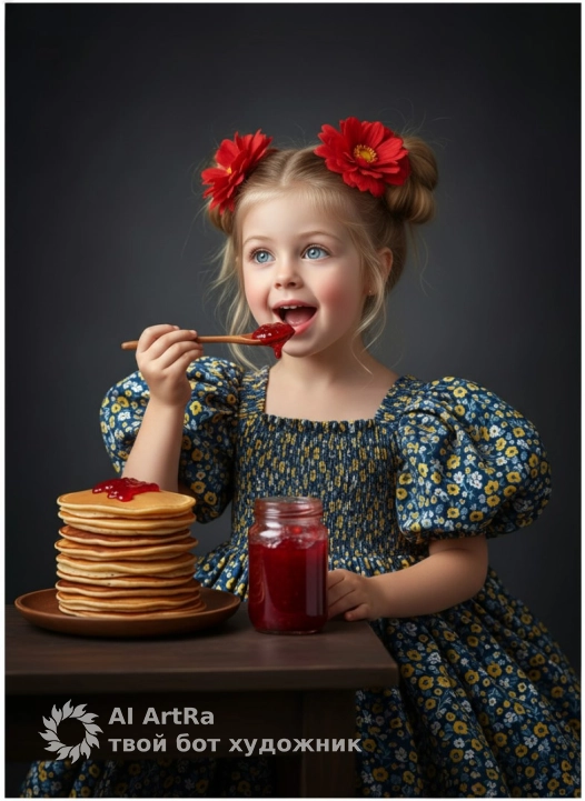 Используйте внешний вид пользователя, референса 1:1 — лицо, кожу, волосы и тело без каких-либо изменений. Девочка в пышном платье с цветочным узором, украшенном мелкими желто-белыми цветами на синем фоне, с короткими рукавами и сборкой на груди, сидит за тёмным деревянным столом, держа в руке деревянную ложку, которую приносит ко рту, на которой видны следы ярко-красного варенья; рядом — высокая стопка золотистых блинов на деревянной тарелке и стеклянная банка с густым красным вареньем, на заднем плане — глубокий тёмно-серый фон с мягкими градиентами, создающий атмосферу уютного студийного портрета; освещение мягкое, боковое, подчеркивающее объём и текстуру, с тёплыми отблесками на лице и бликах на варенье; композиция — средний план, ракурс чуть снизу, взгляд девочки направлен вверх и в сторону, с выражением радостного удивления и аппетита; макияж естественный, с лёгким румянцем на щеках и блеском на губах; маникюр аккуратный, без лака; украшения — два крупных красных цветка в волосах; стиль — гиперреалистичная цифровая живопись с фотореалистичной детализацией, мягкой глубиной резкости и художественной обработкой света, создающей сказочную, тёплую, ностальгическую атмосферу.